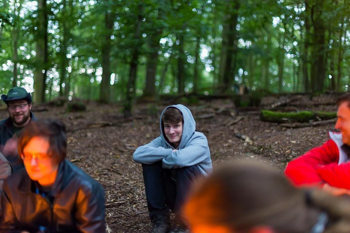 Lagerfeuer in einem Wald, mehrere Personen sitzen im Kreis und unterhalten sich