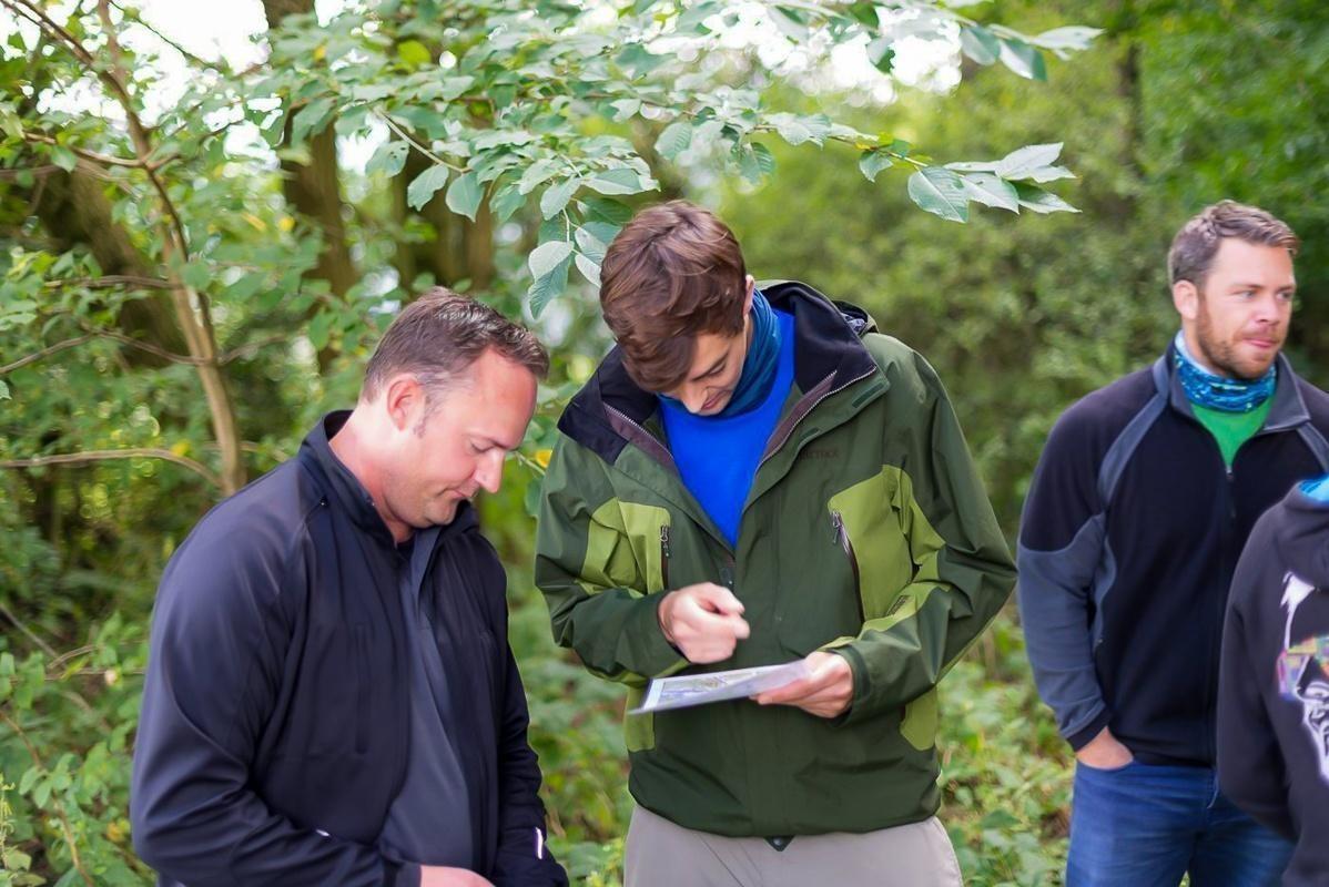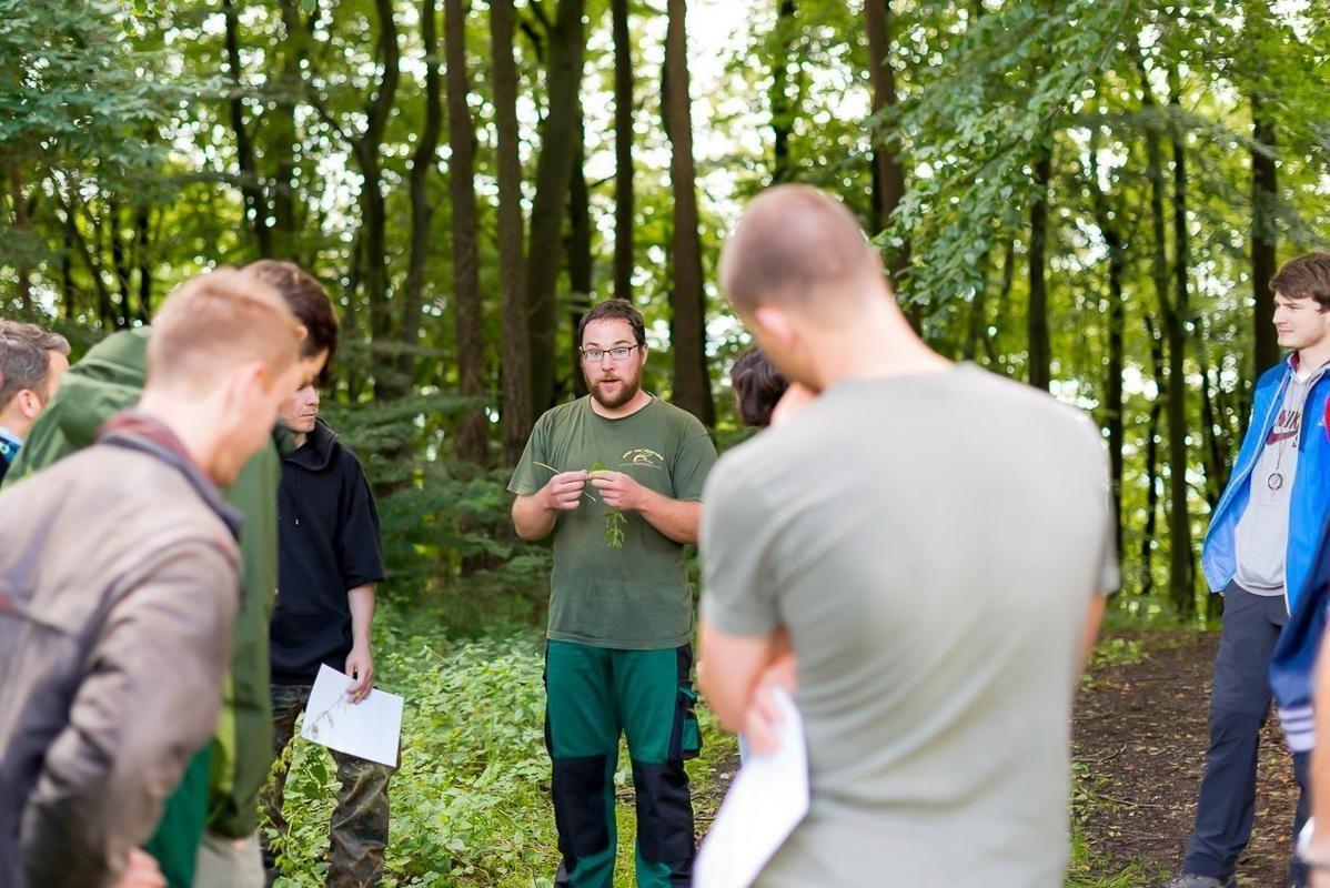 Mann erklärt einer Gruppe von Teilnehmern etwas im Wald