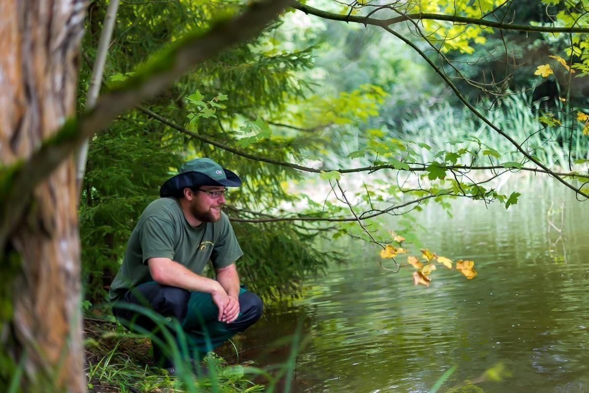 Mann hockt am Ufer eines Gewässers und beobachtet das Wasser