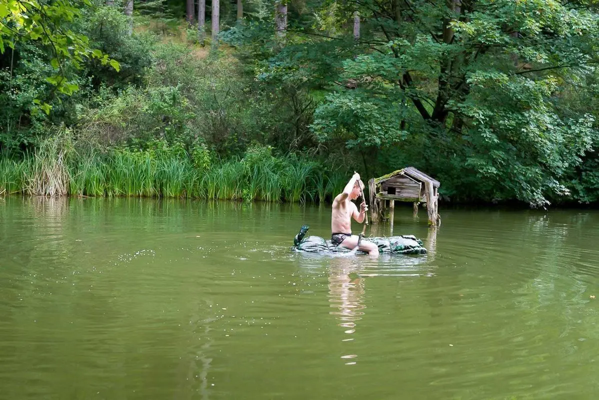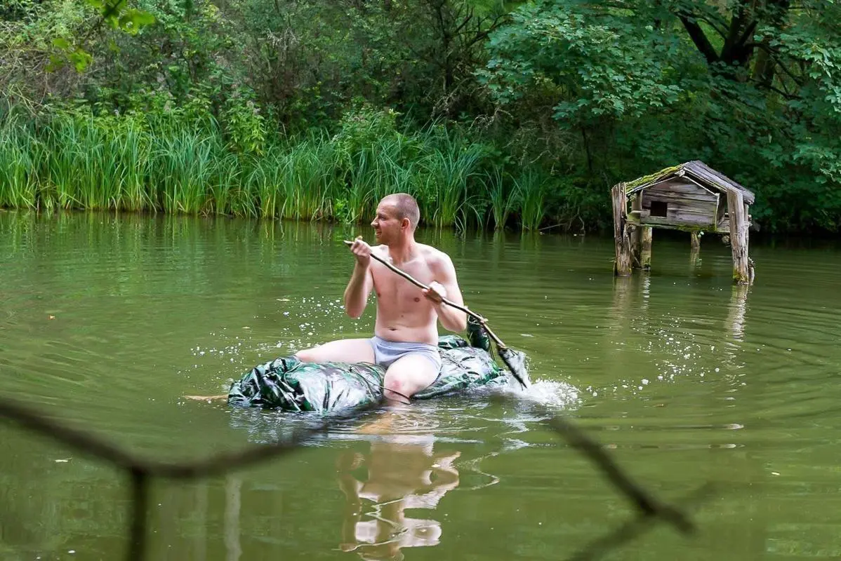 Mann paddelt in einem camouflagefarbenen Schlauchboot auf einem ruhigen Gewässer