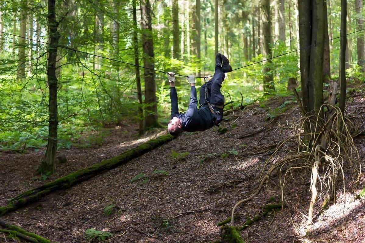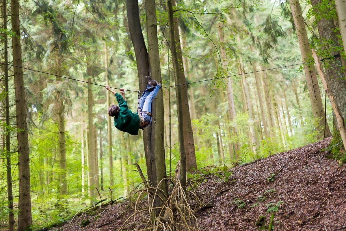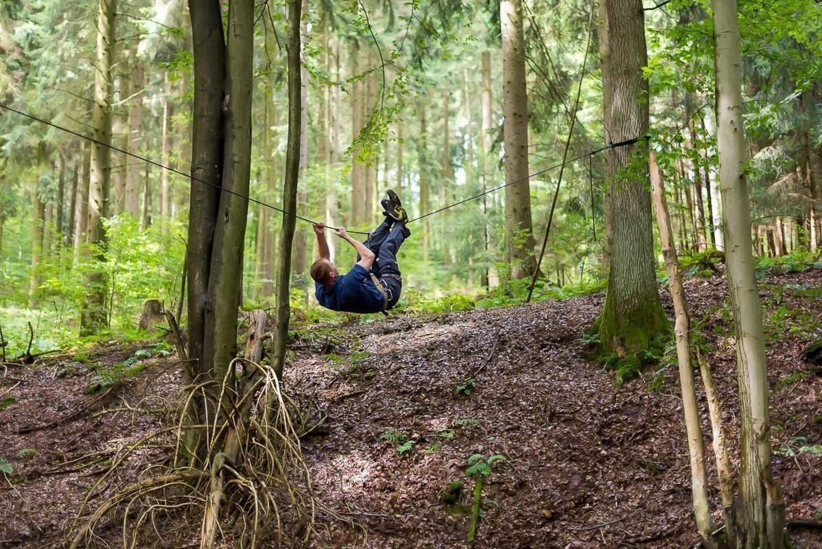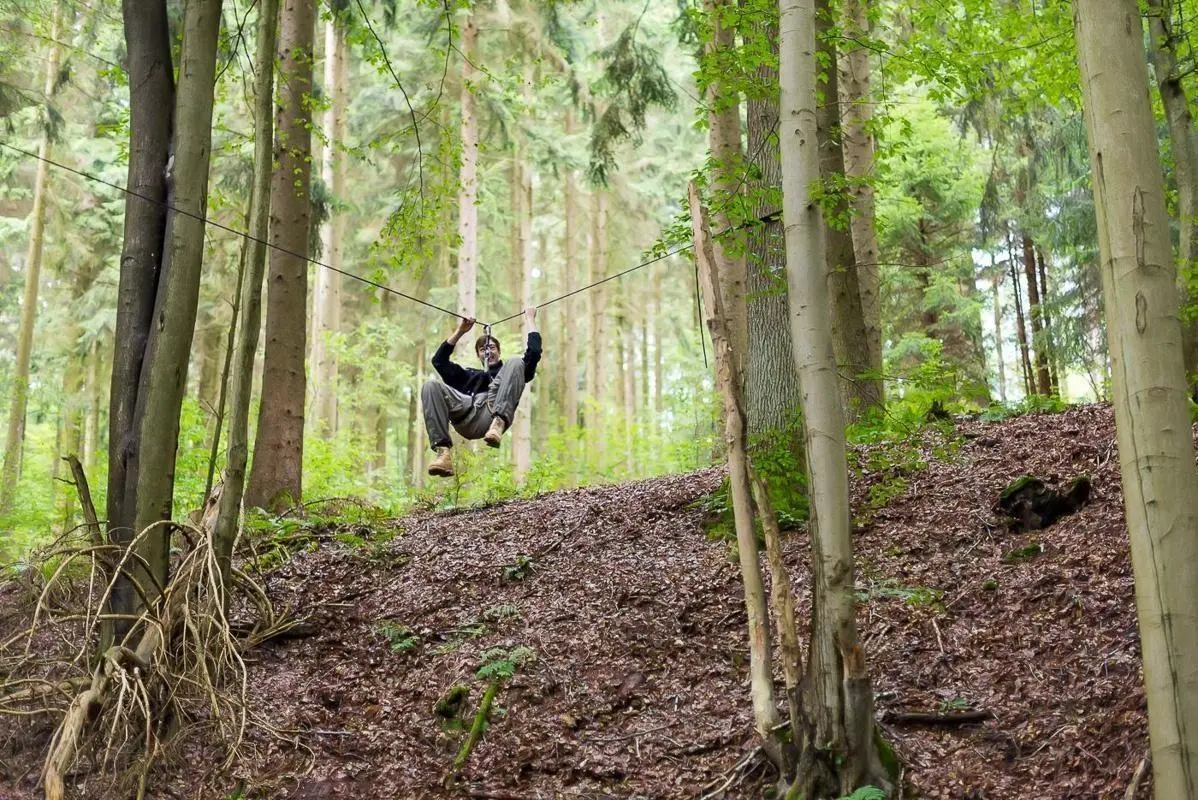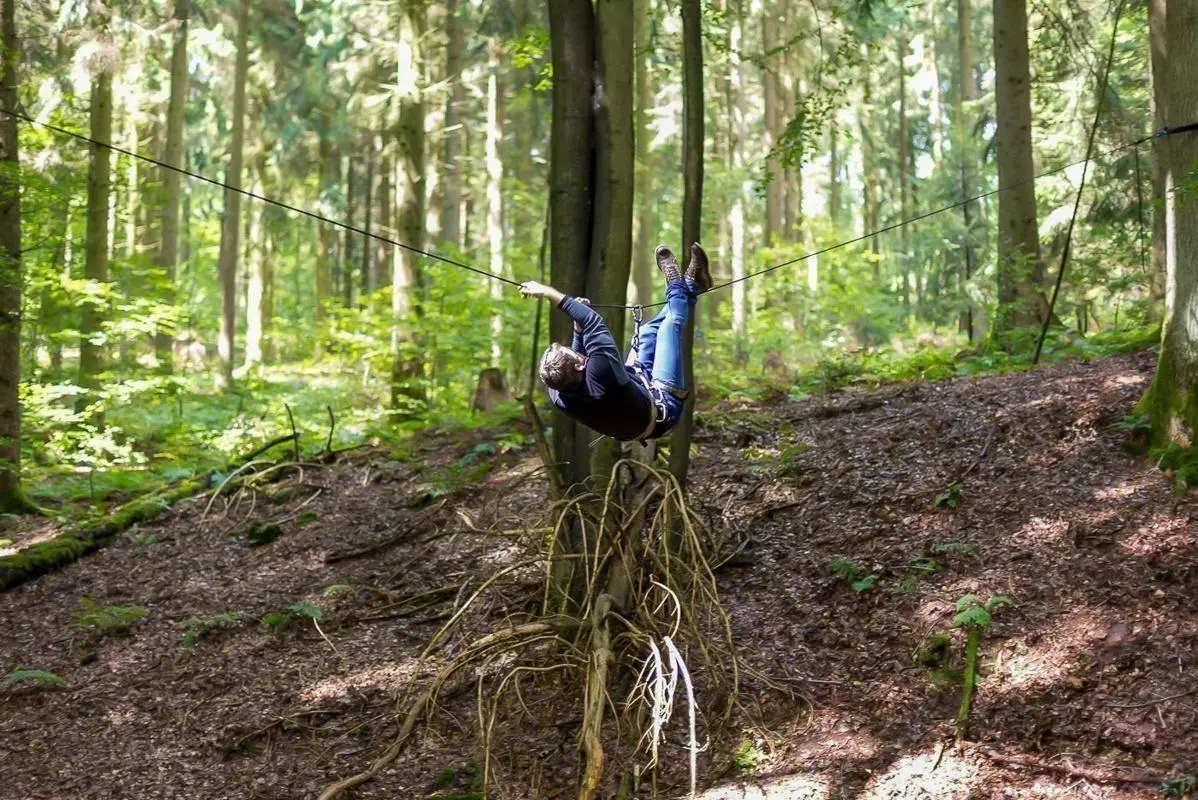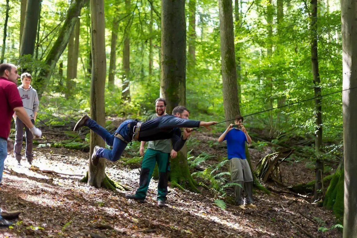 Seilquerung mit mehreren Personen im Wald, eine Person überquert an einem Seil