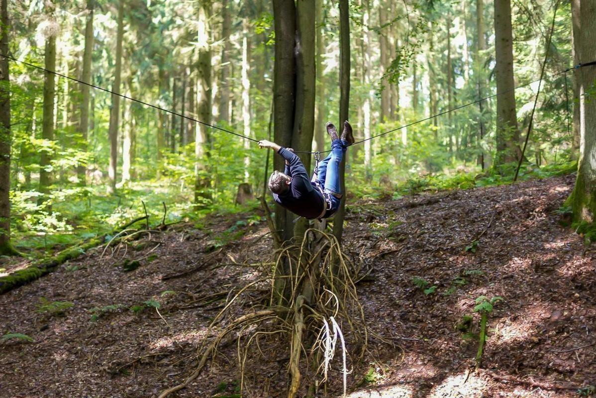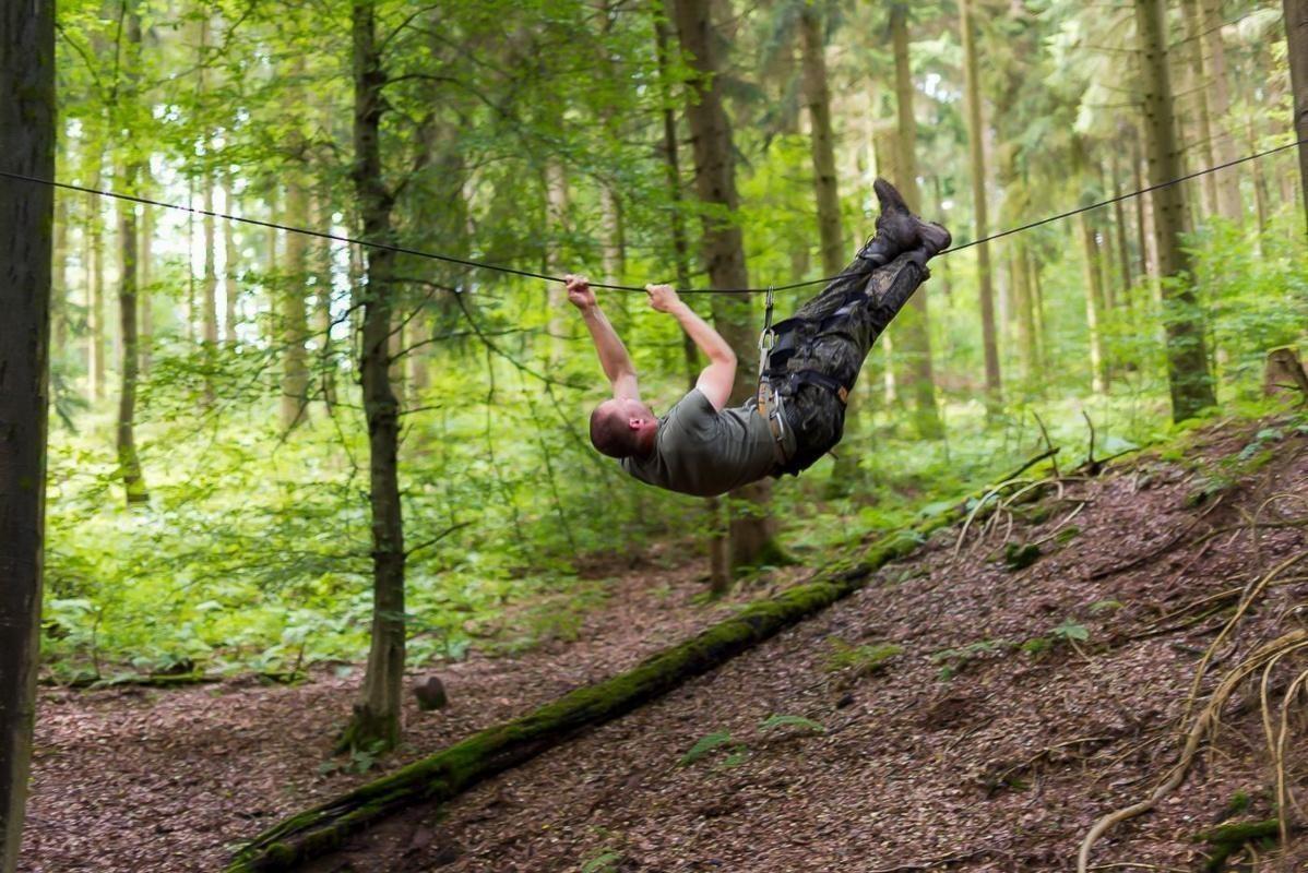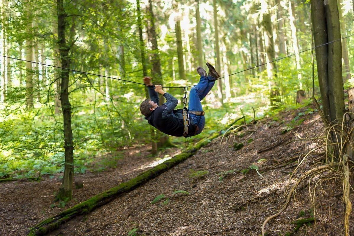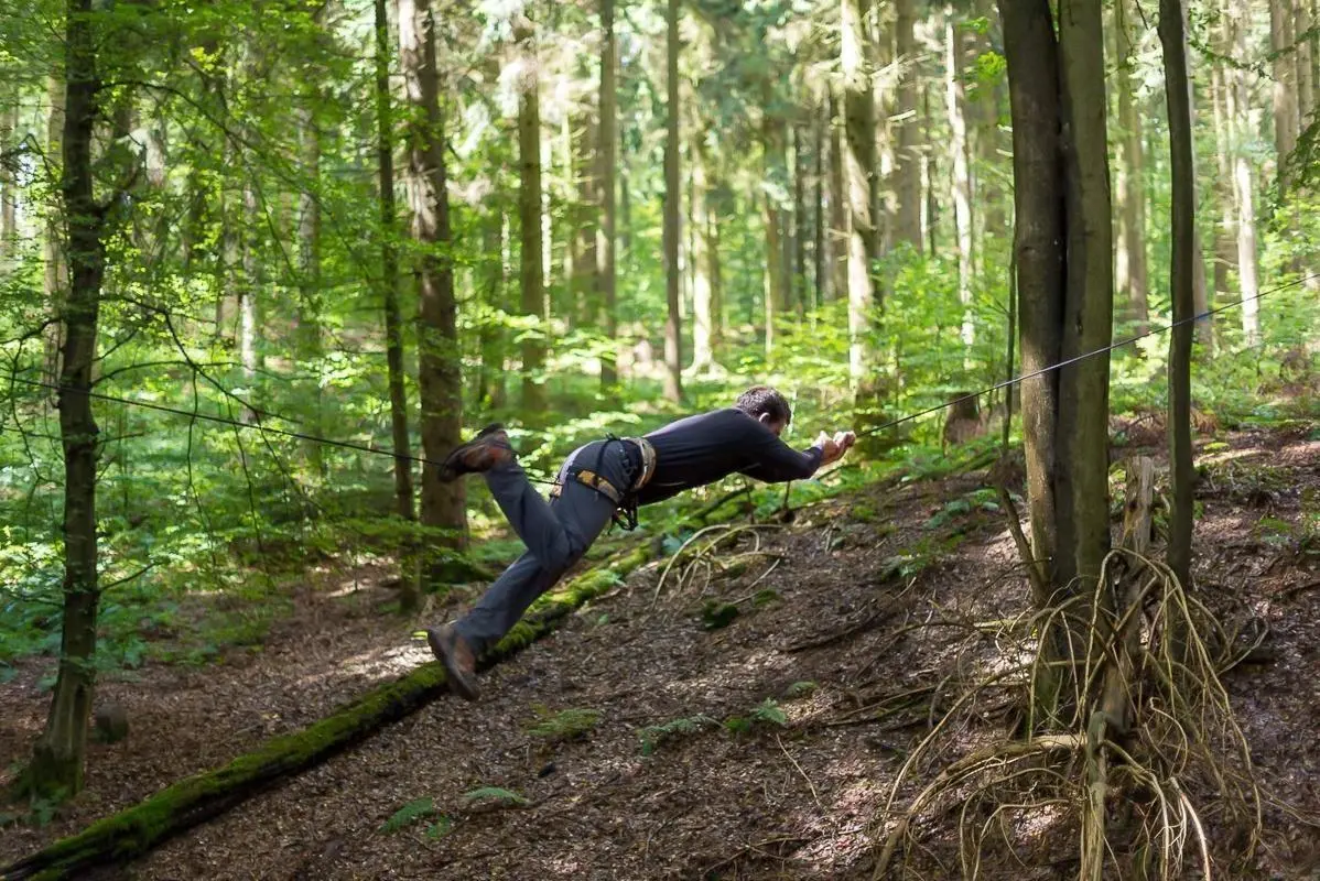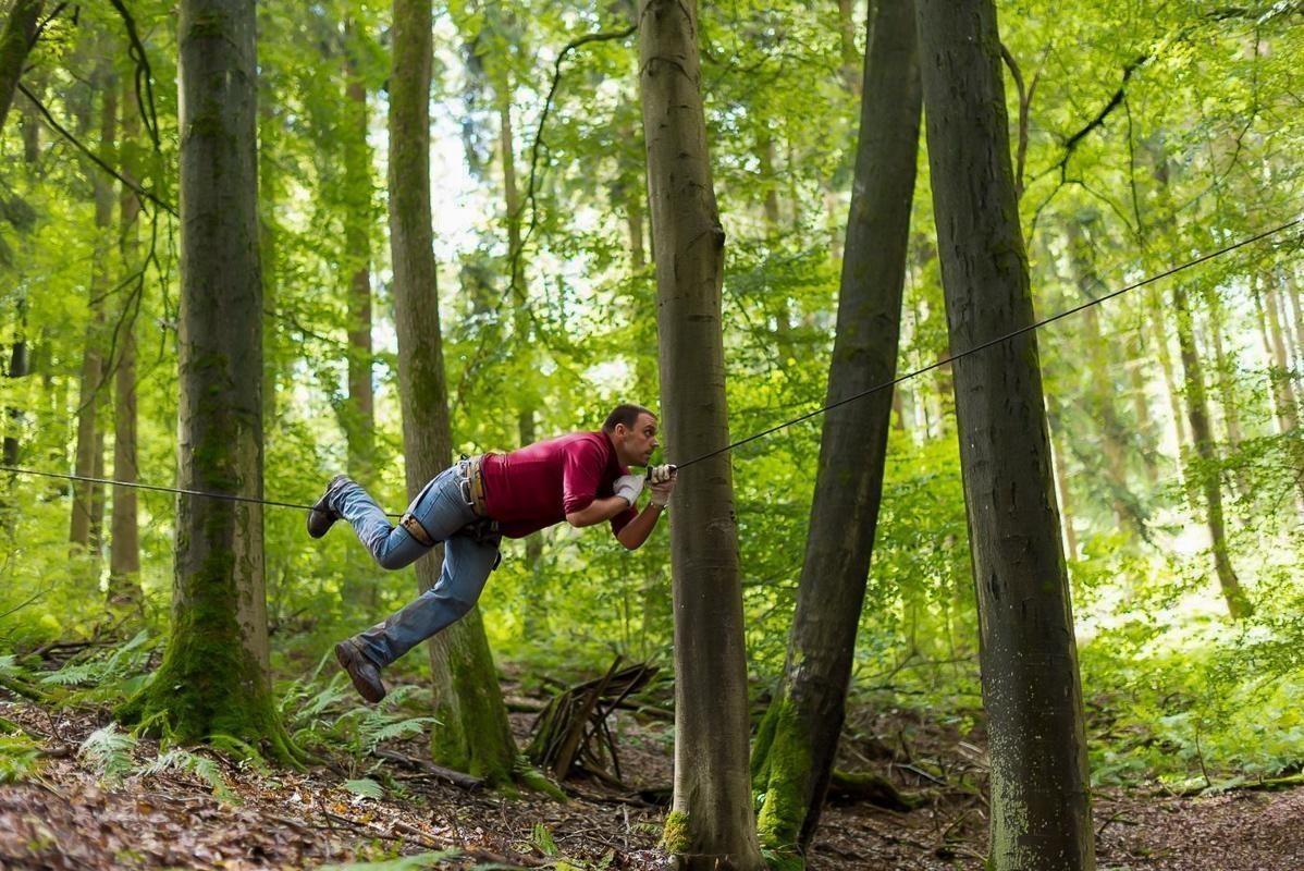 Seilquerung mit mehreren Personen im Wald, eine Person überquert an einem Seil