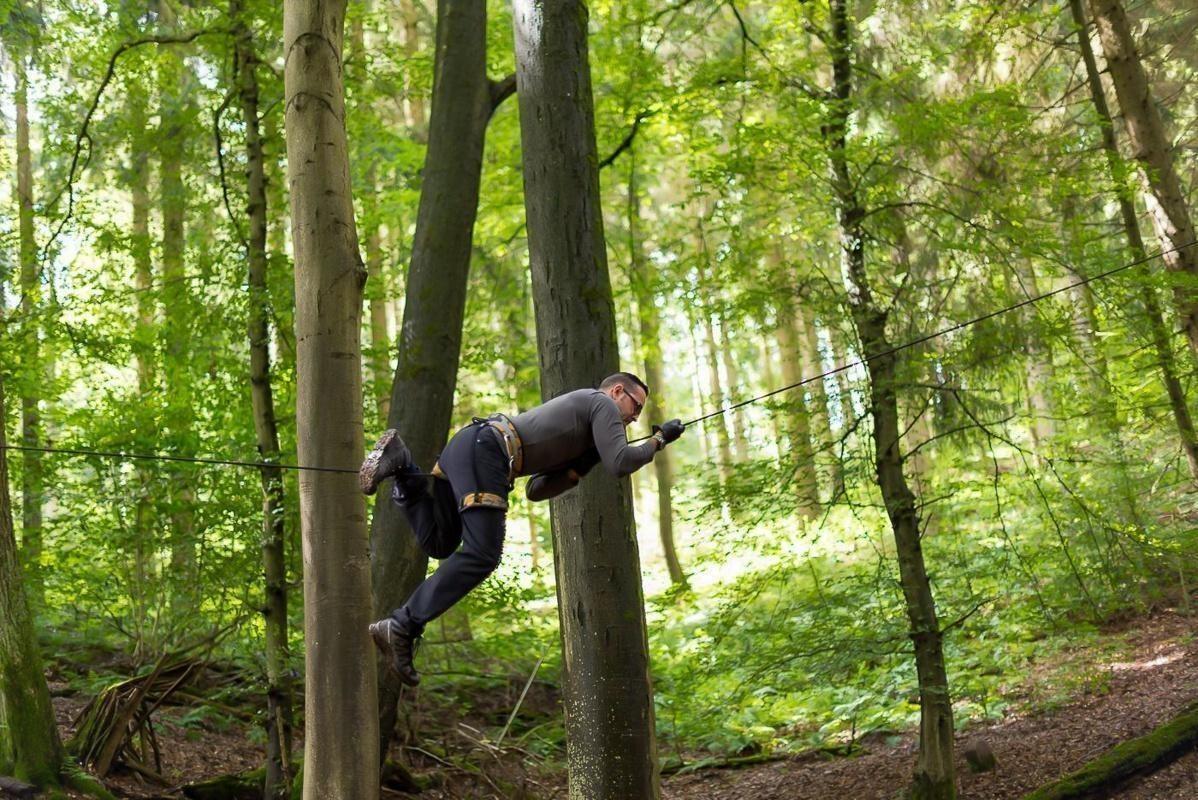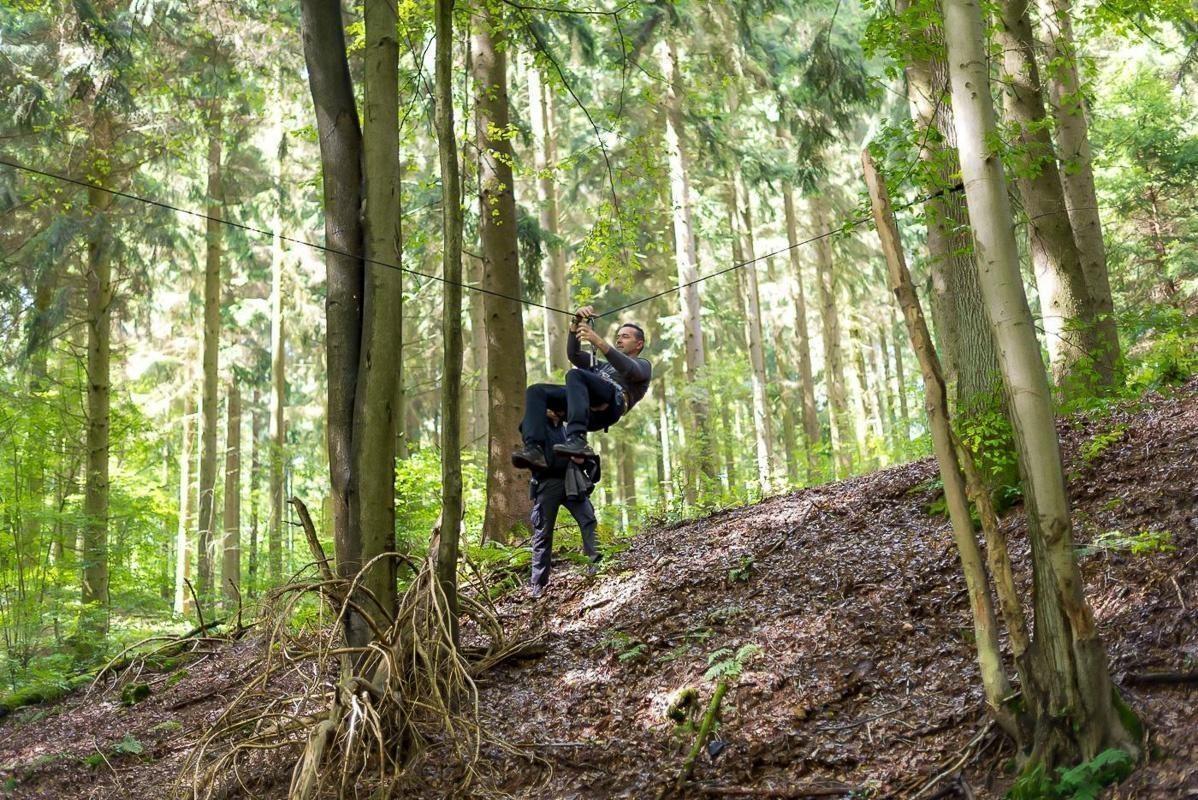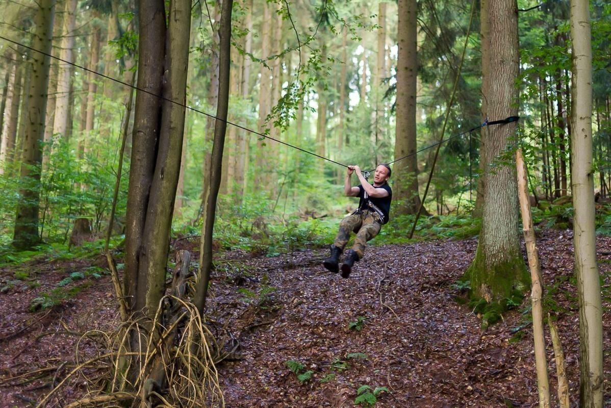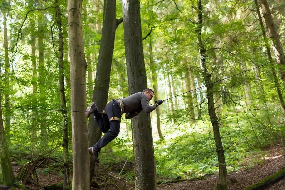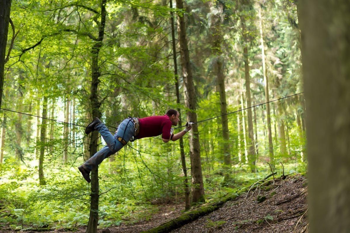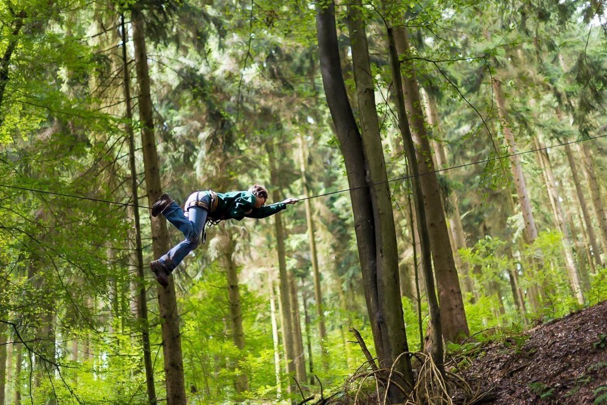 Seilquerung mit mehreren Personen im Wald, eine Person überquert an einem Seil