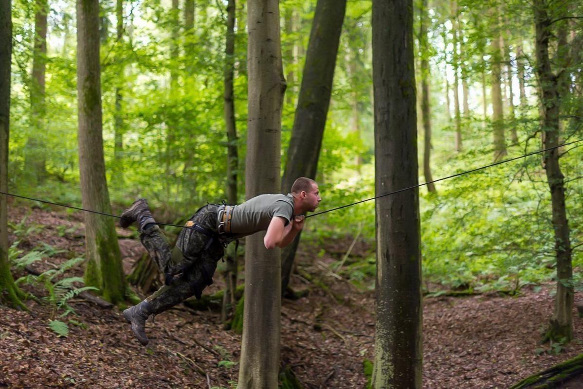 Teilnehmer überquert eine selbstgebaute Seilbrücke im Wald