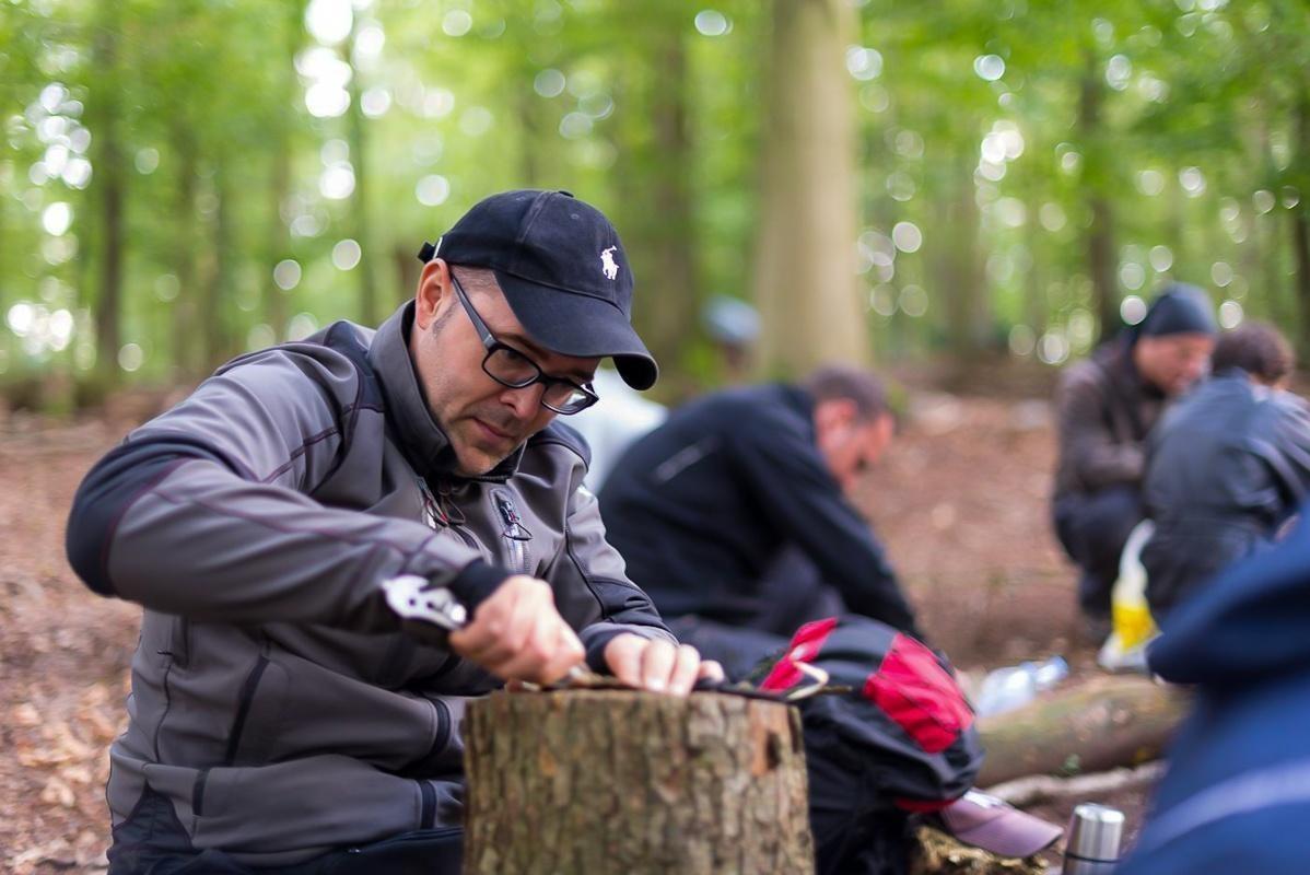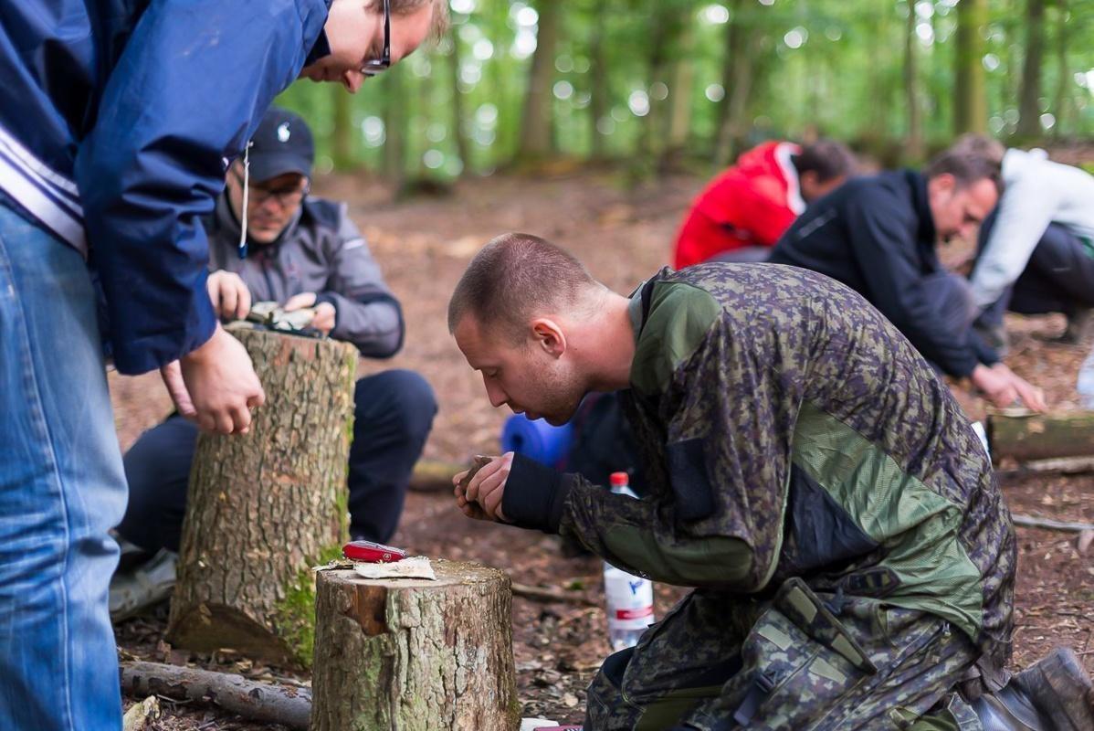 Messer schneidet Zunder auf einem Baumstumpf, während Teilnehmer umherarbeiten