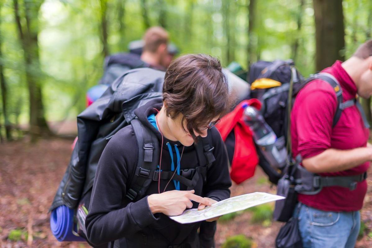 Person studiert Karte im Wald, Rucksäcke im Hintergrund