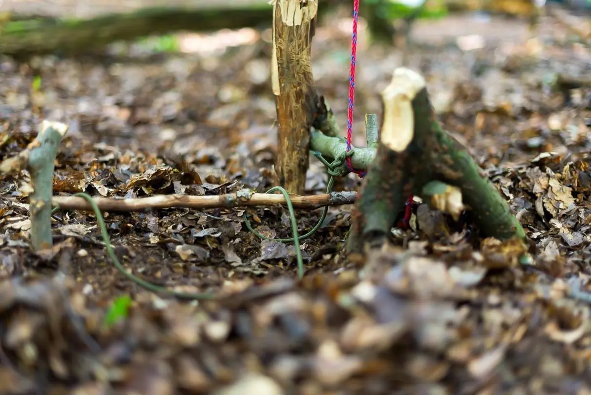 Schlagfalle (Figure-Four-Falle) aus Ästen und Schnur im Laubboden