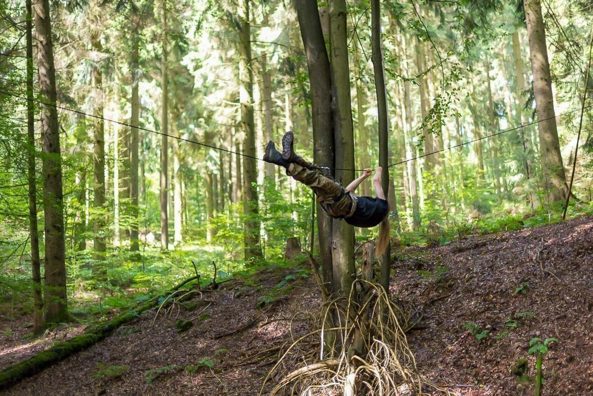 Seilquerung mit einer selbstgebauten Seilbrücke im Wald