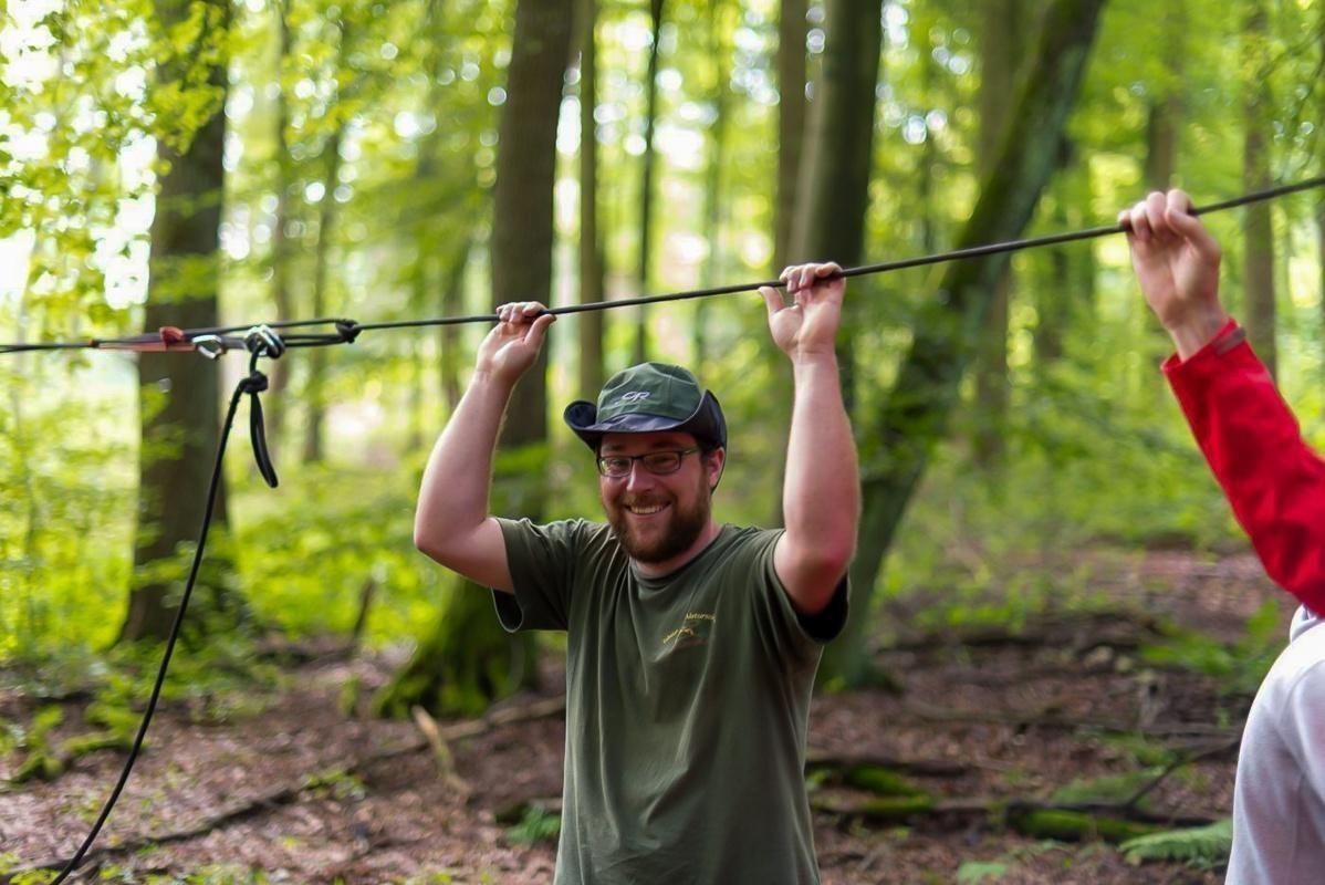 Teilnehmer bauten eine selbstgebaute Seilbrücke zwischen zwei Bäumen auf