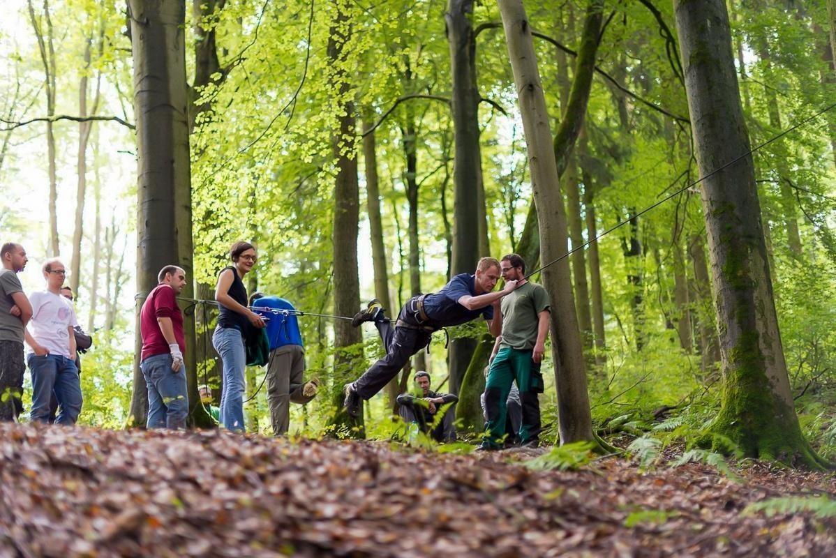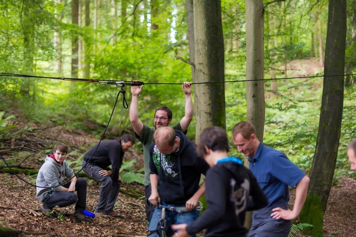 Gruppierung von Personen bei einer Seilquerung im Wald, Seil zwischen Bäumen gespannt