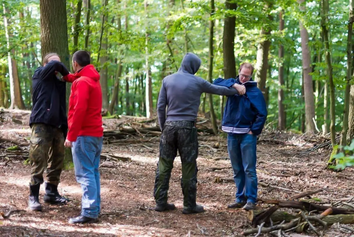 Gruppentraining im Wald, eine Person demonstriert eine Technik zur Selbstverteidigung