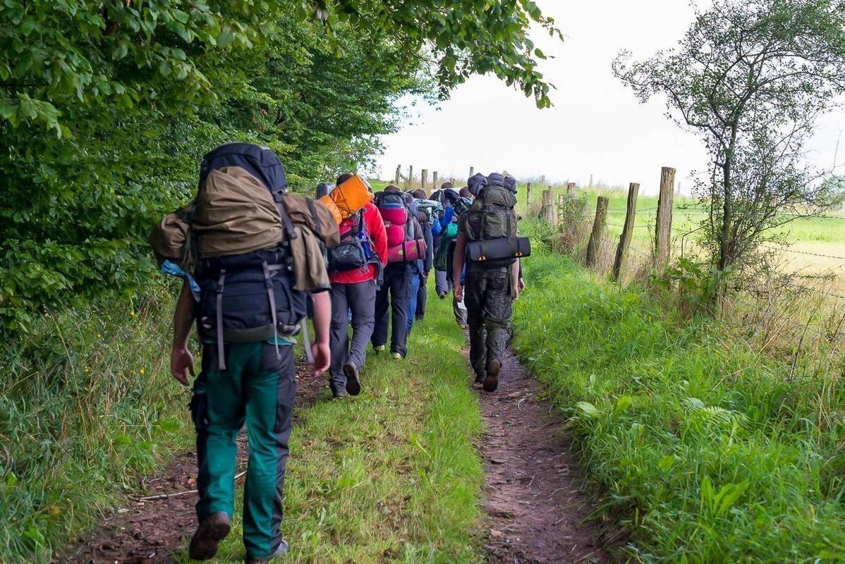 Wandernde Gruppe mit Rucksäcken auf einem schmalen Pfad entlang einer Wiese