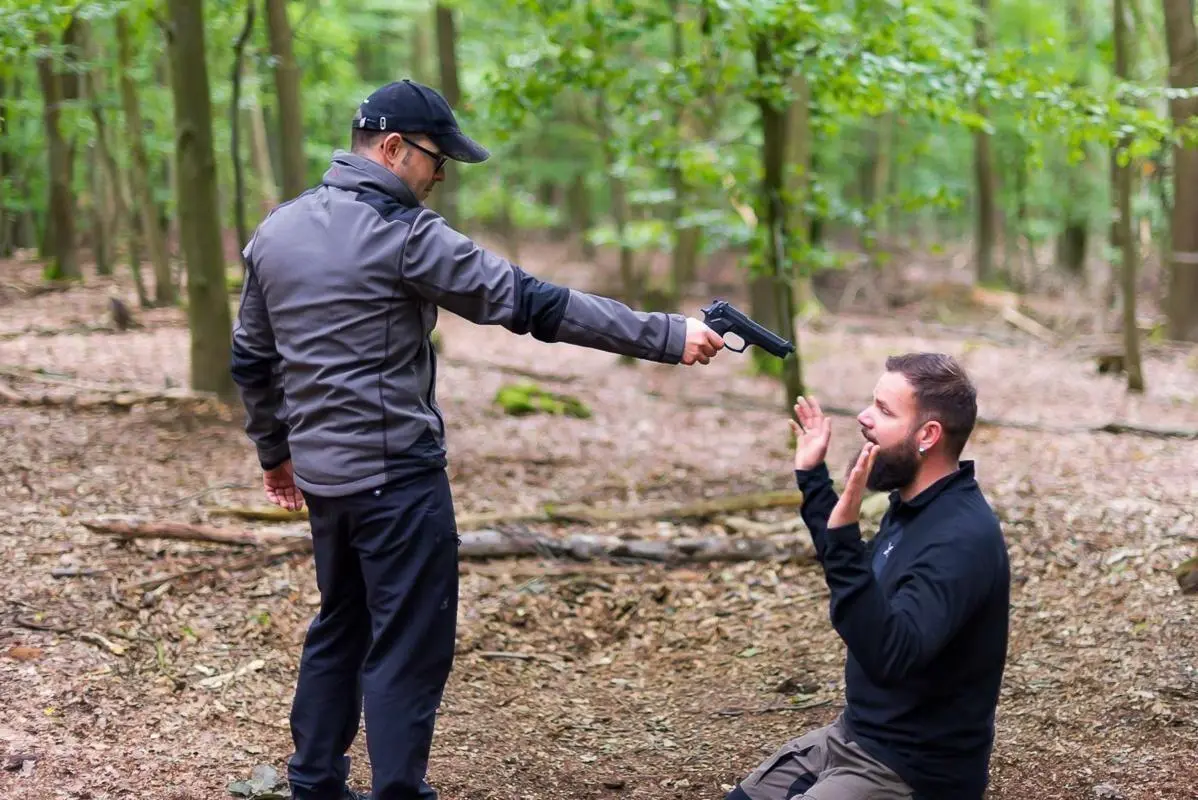 Zwei Personen im Wald, eine kniet nieder und hebt die Hände, während die andere eine Pistole hält