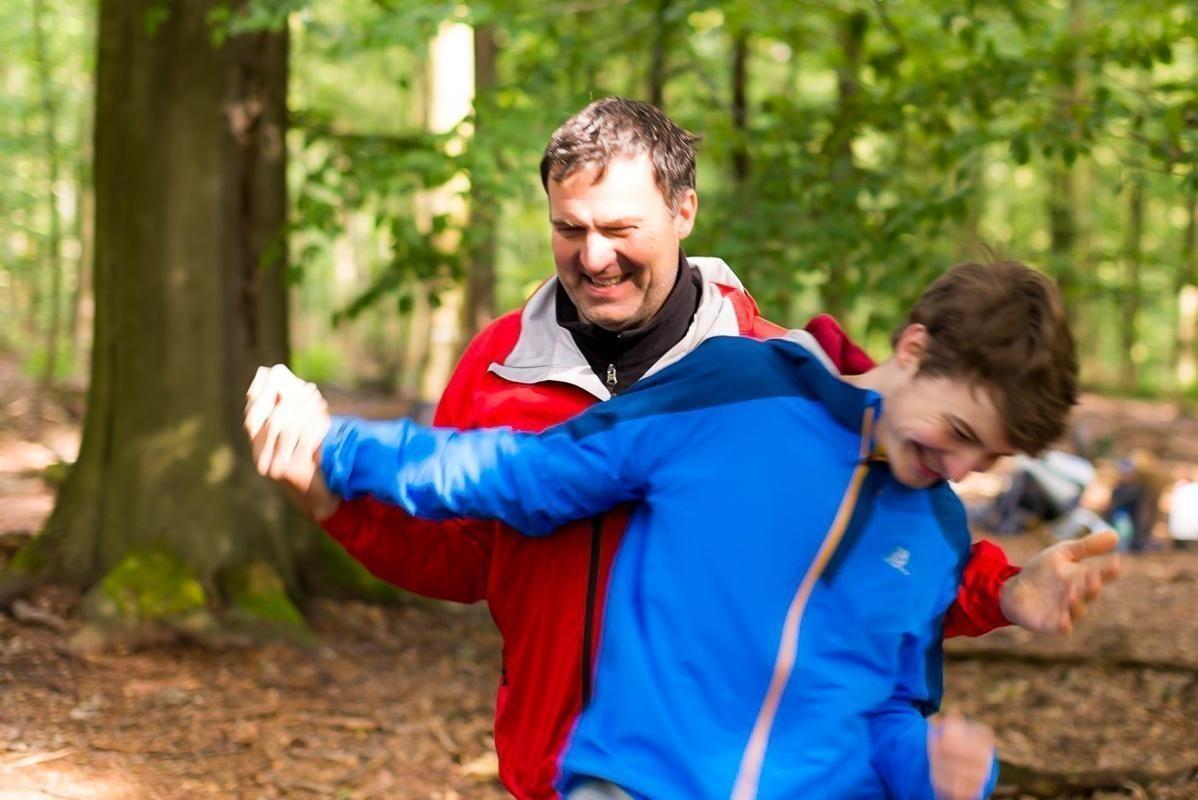 Zwei Personen üben eine Selbstverteidigungstechnik im Wald