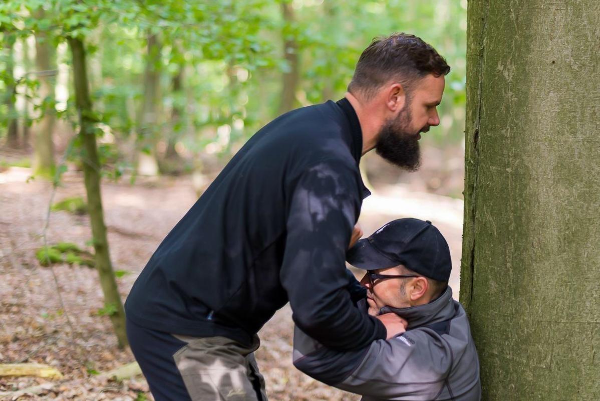 Zwei Personen üben eine Technik zur Kontrolle im Wald