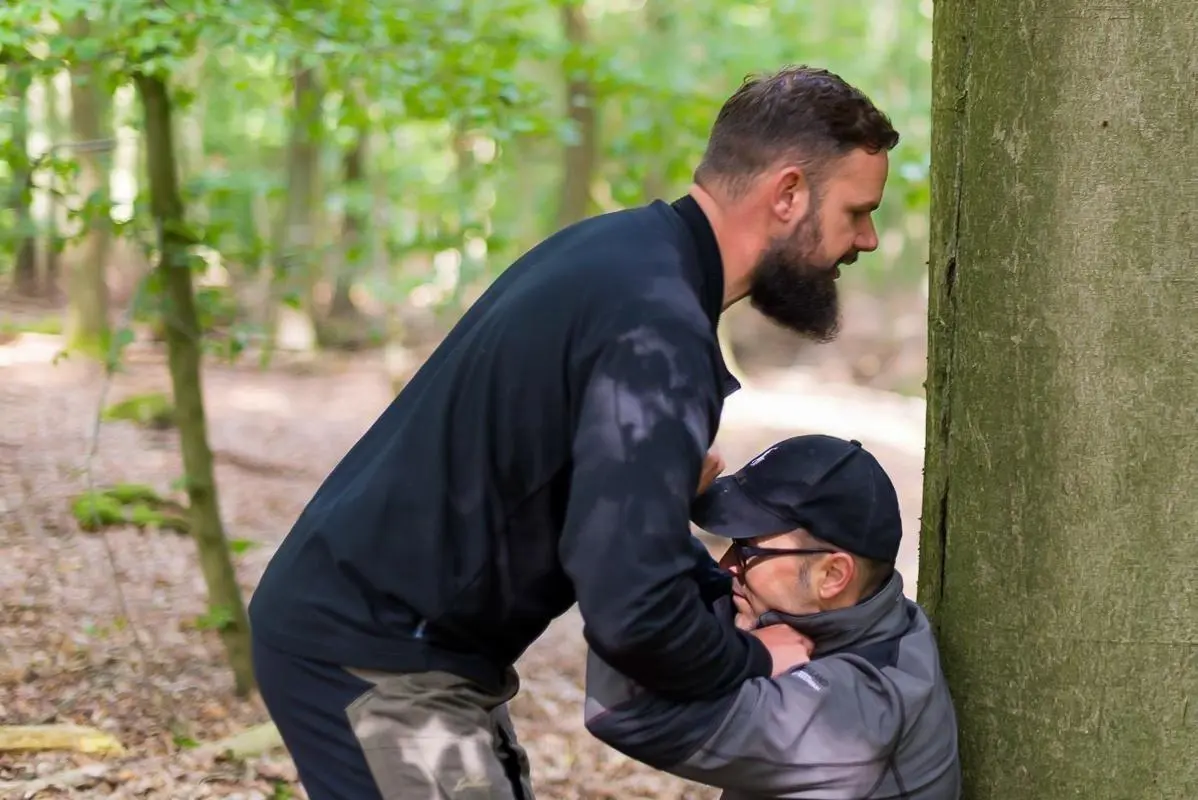 Zwei Männer demonstrieren eine Technik im Wald, umgeben von Bäumen und Laub