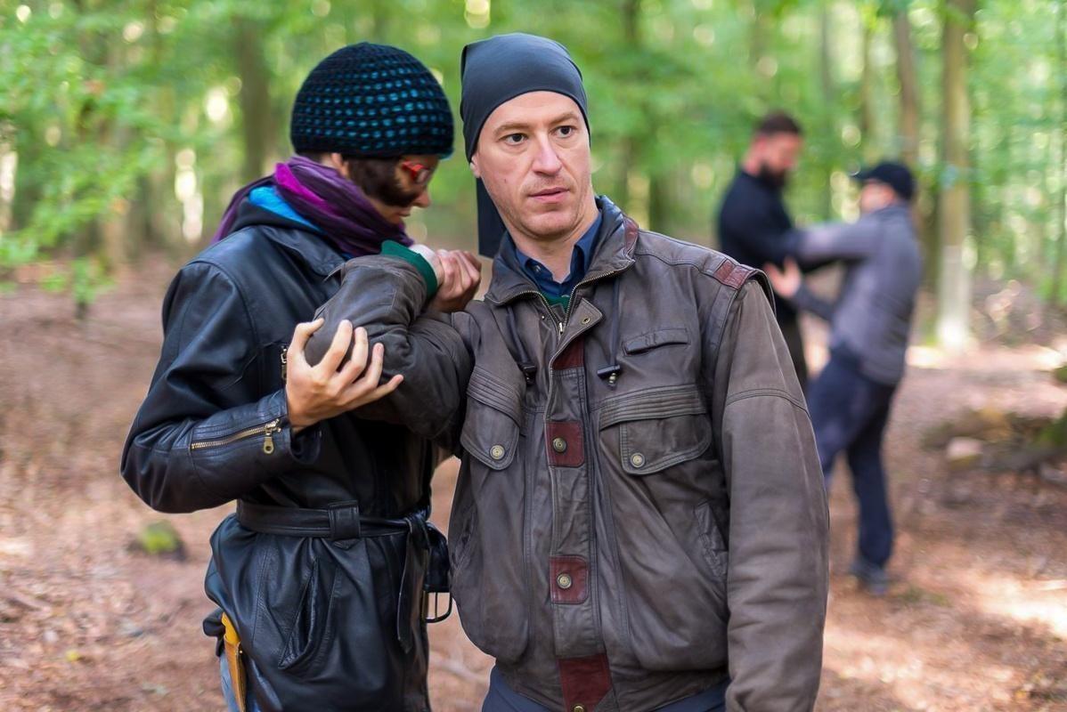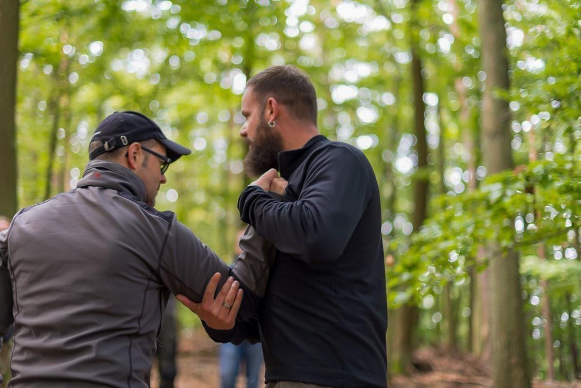 Zwei Personen üben eine Nahkampftechnik im Wald