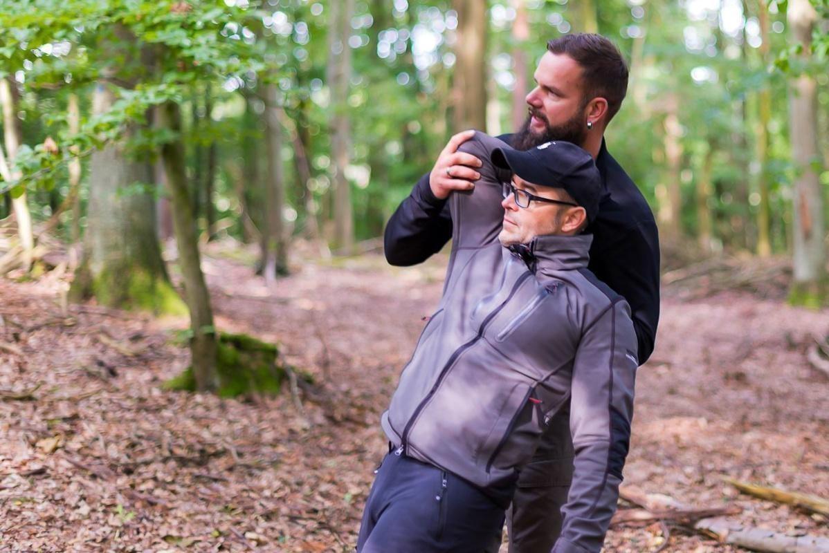 Zwei Personen üben eine Technik zur Selbstverteidigung im Wald