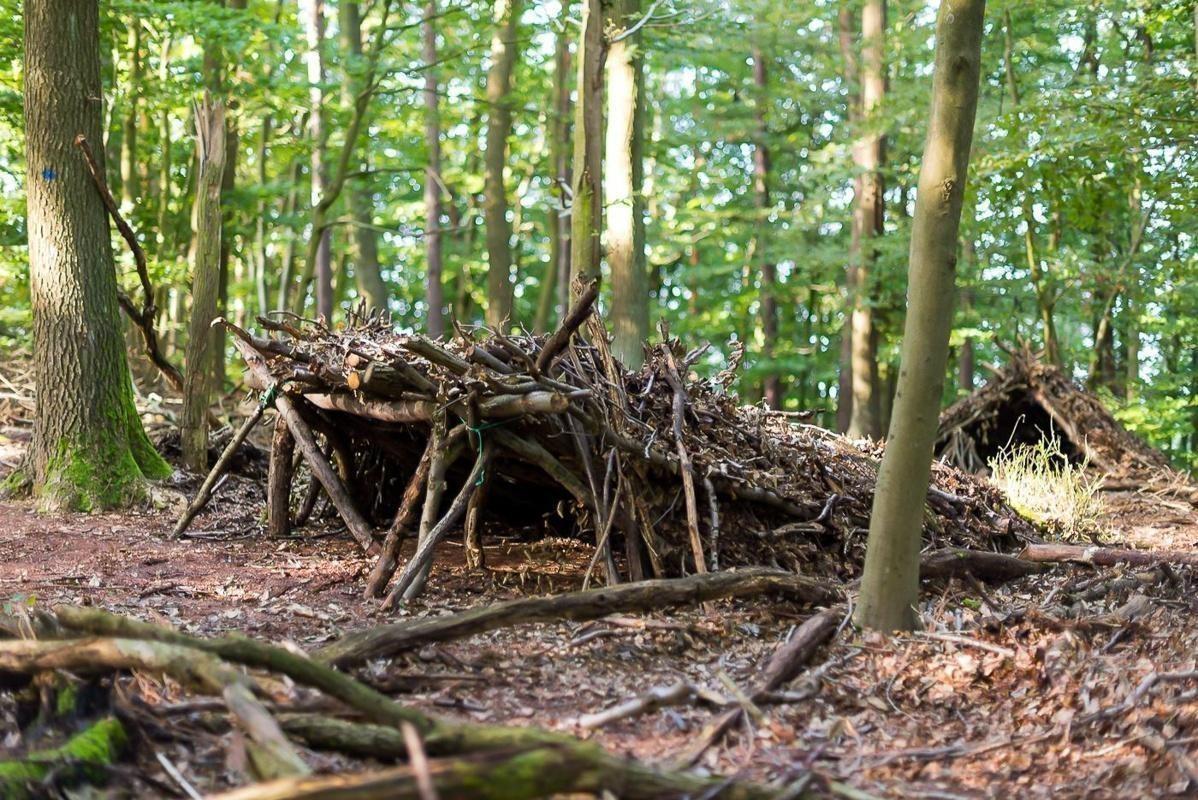 Laubhütte aus Ästen und Blättern in einem Waldgebiet