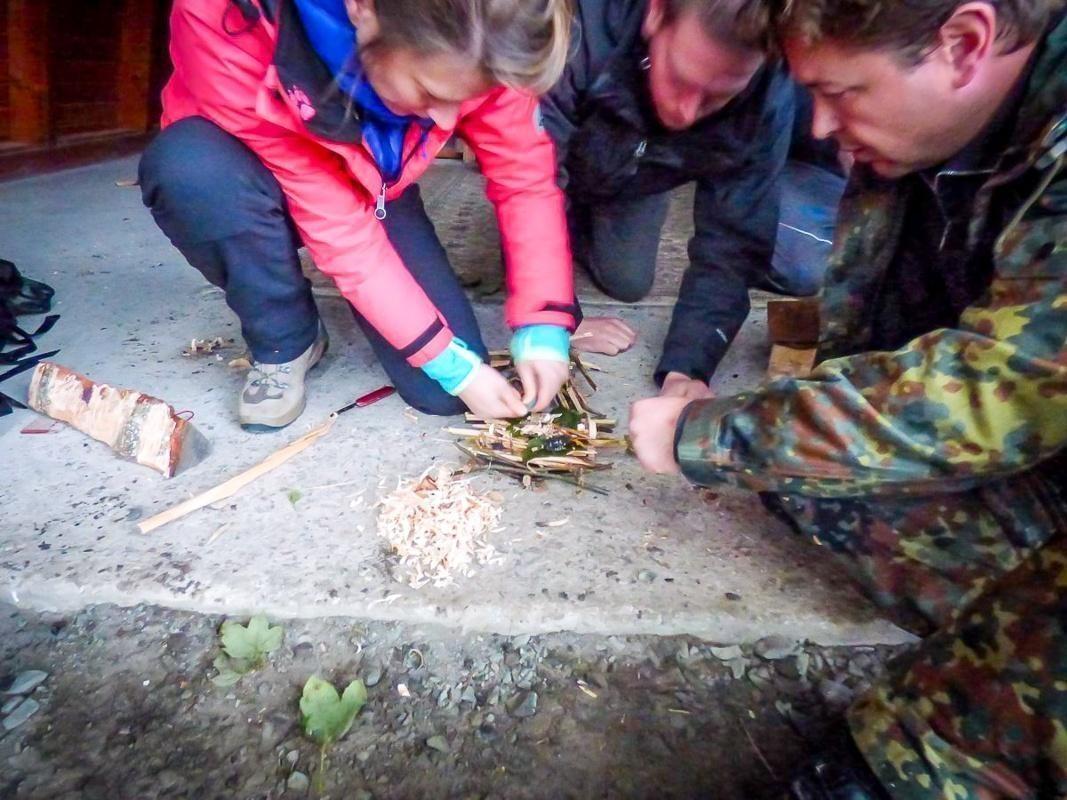 Zunder wird in einer Gruppe vorbereitet, um ein Feuer zu entzünden