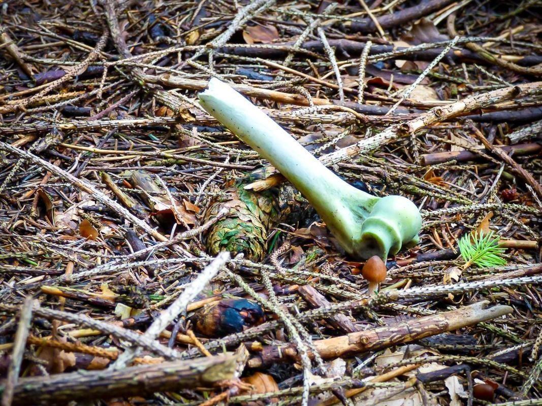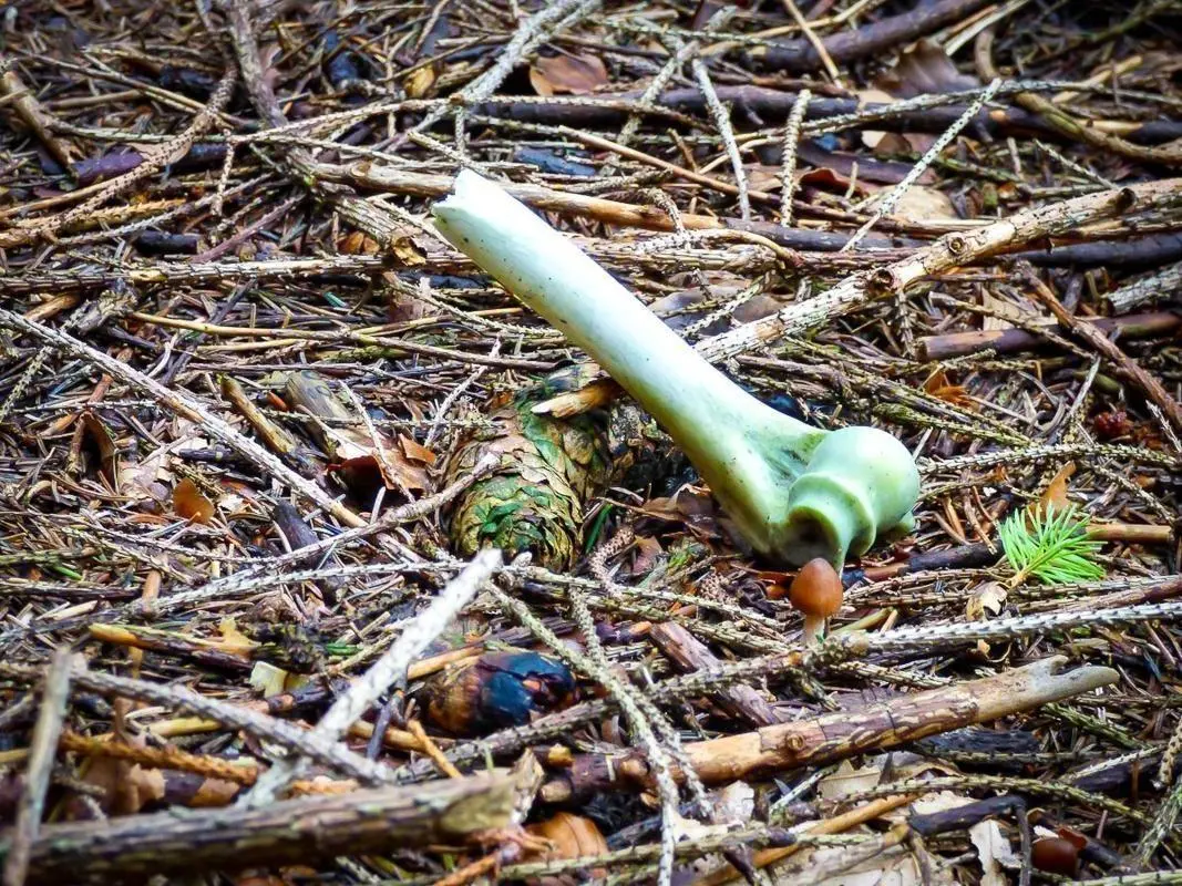 Ein grüner Knochen liegt auf dem Waldboden zwischen Ästen und Laub