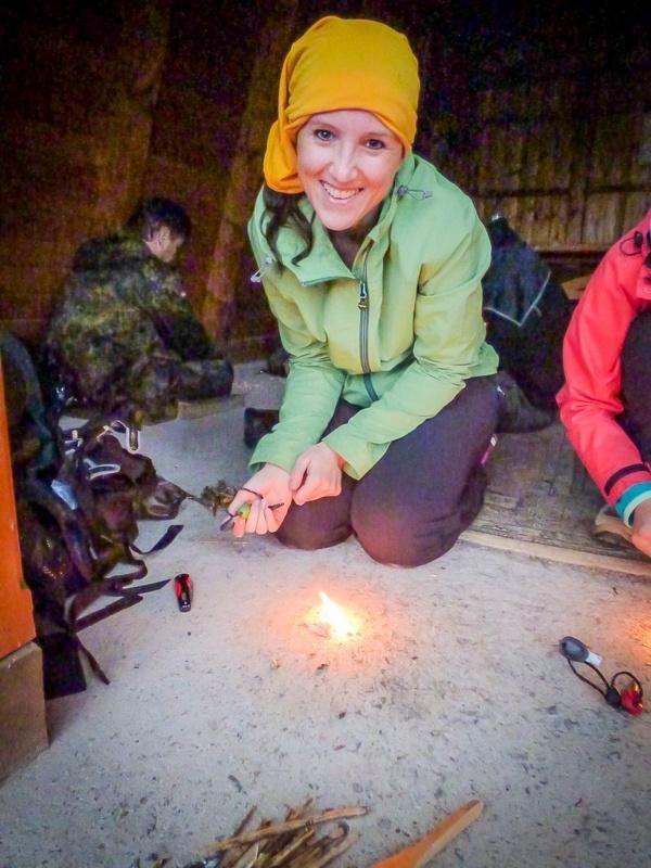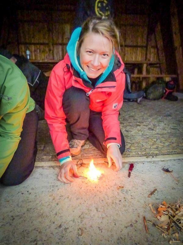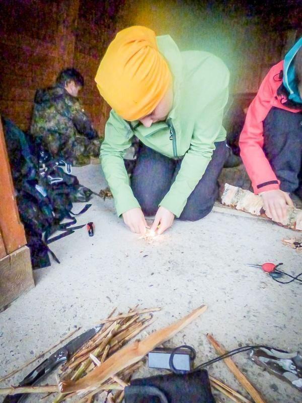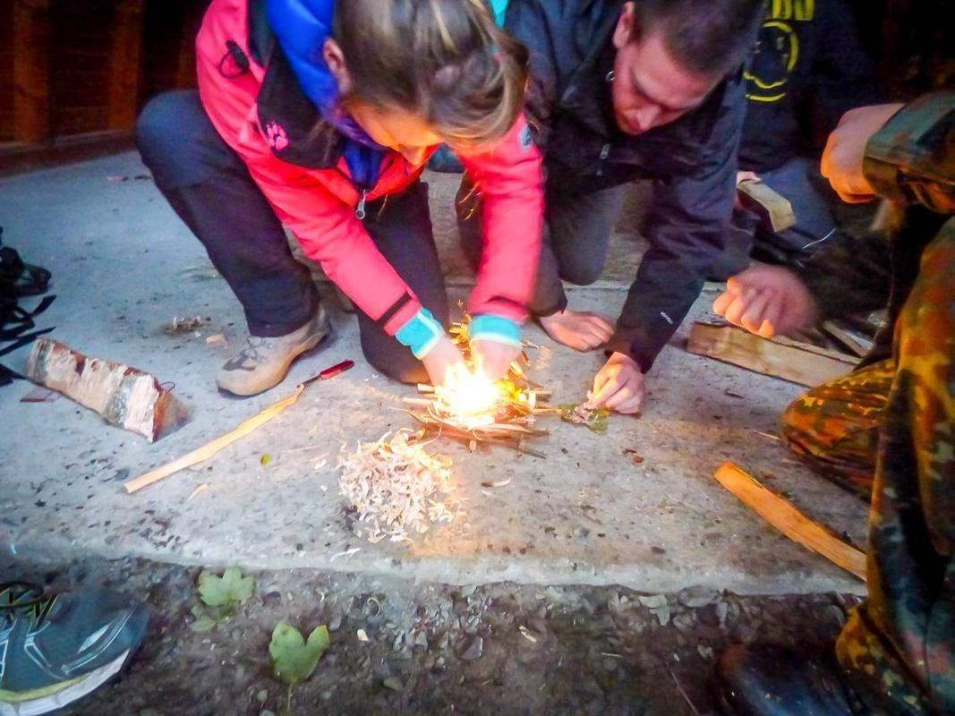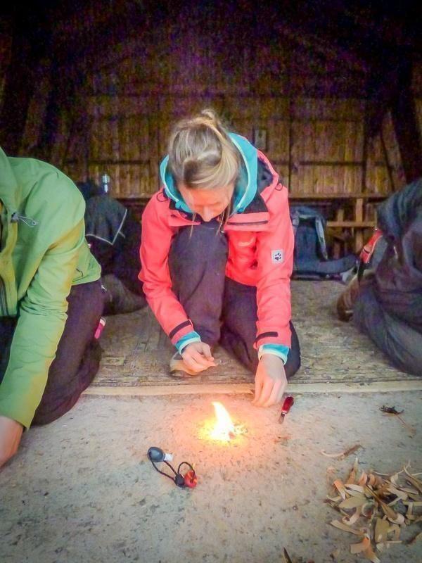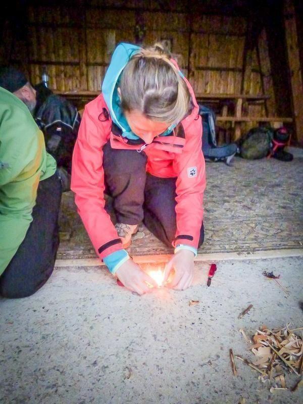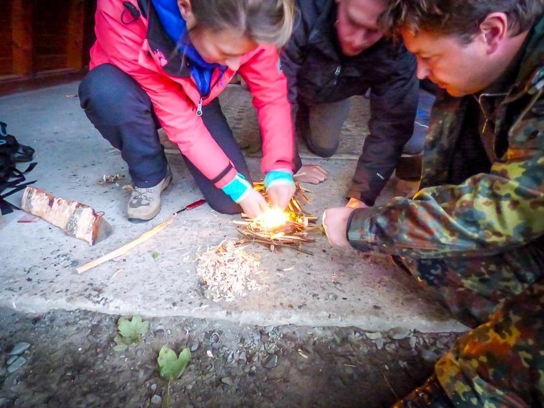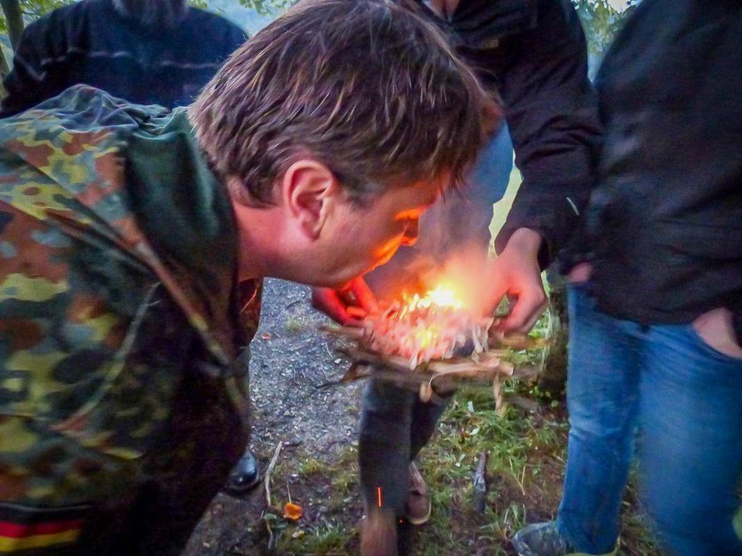 Feuerstahl erzeugt Funken auf Zunder während mehrere Personen um das Feuer herum arbeiten