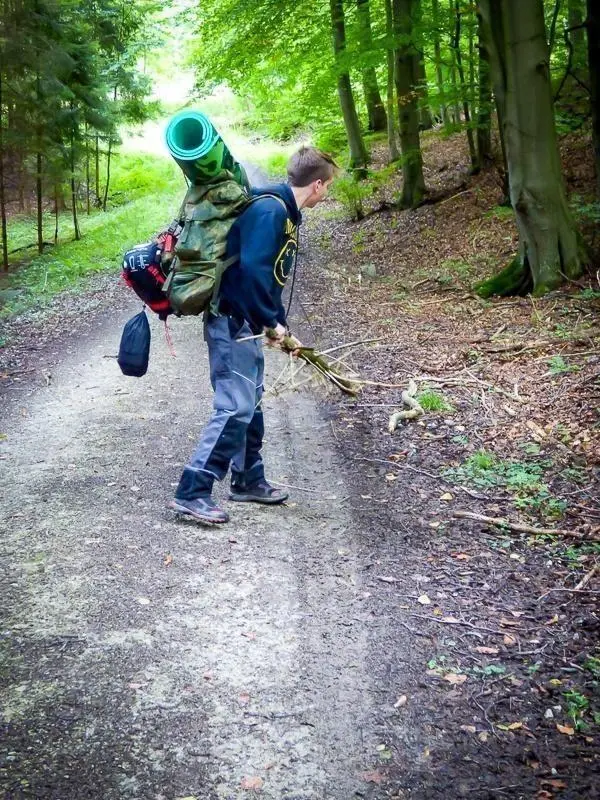 Junge hebt einen Stock auf einem Waldweg mit Rucksack und Isomatte