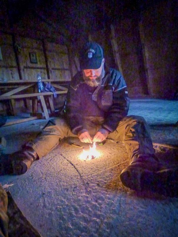 Zunder glimmt vor einer Person in einer Notunterkunft