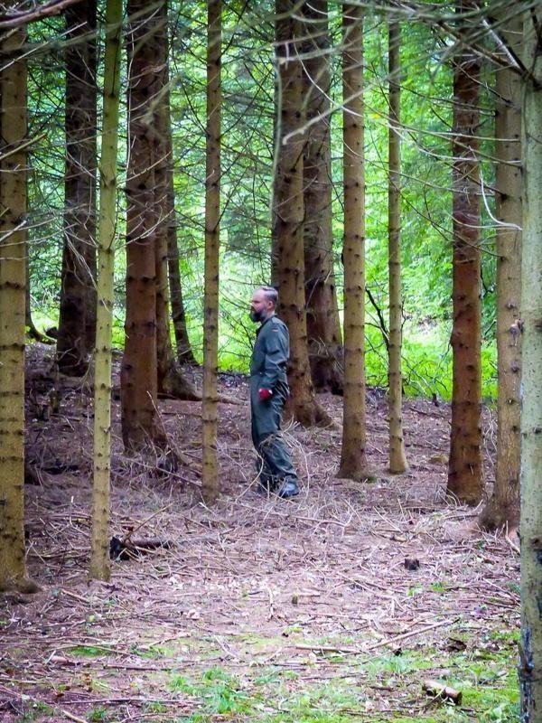 Zwei Personen stehen auf einem Haufen aus Ästen und Zweigen im Wald