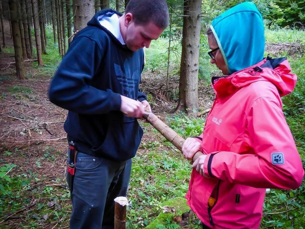 Zwei Personen arbeiten an einer Holzstütze im Wald, eine Person beobachtet