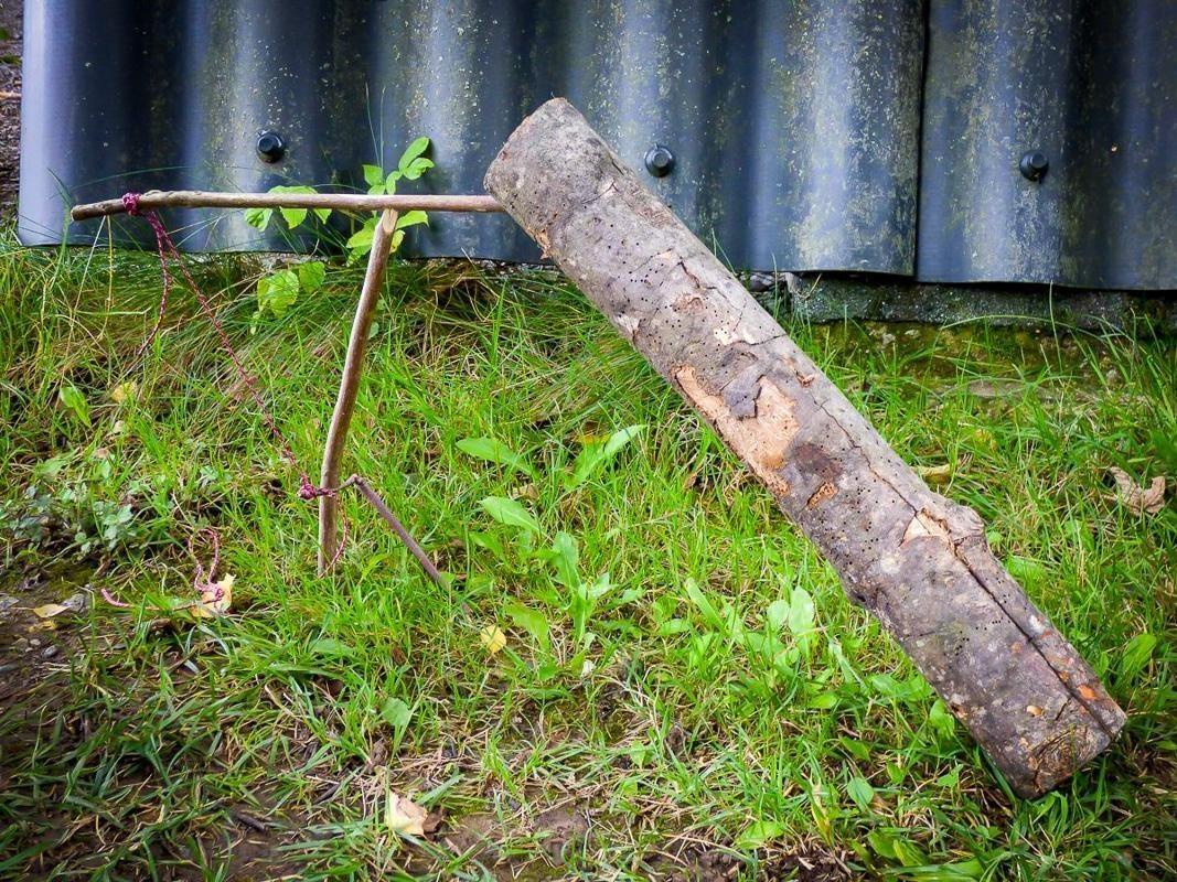 Schlagfalle (Figure-Four/4er-Falle) aus Holzstücken im Gras aufgebaut