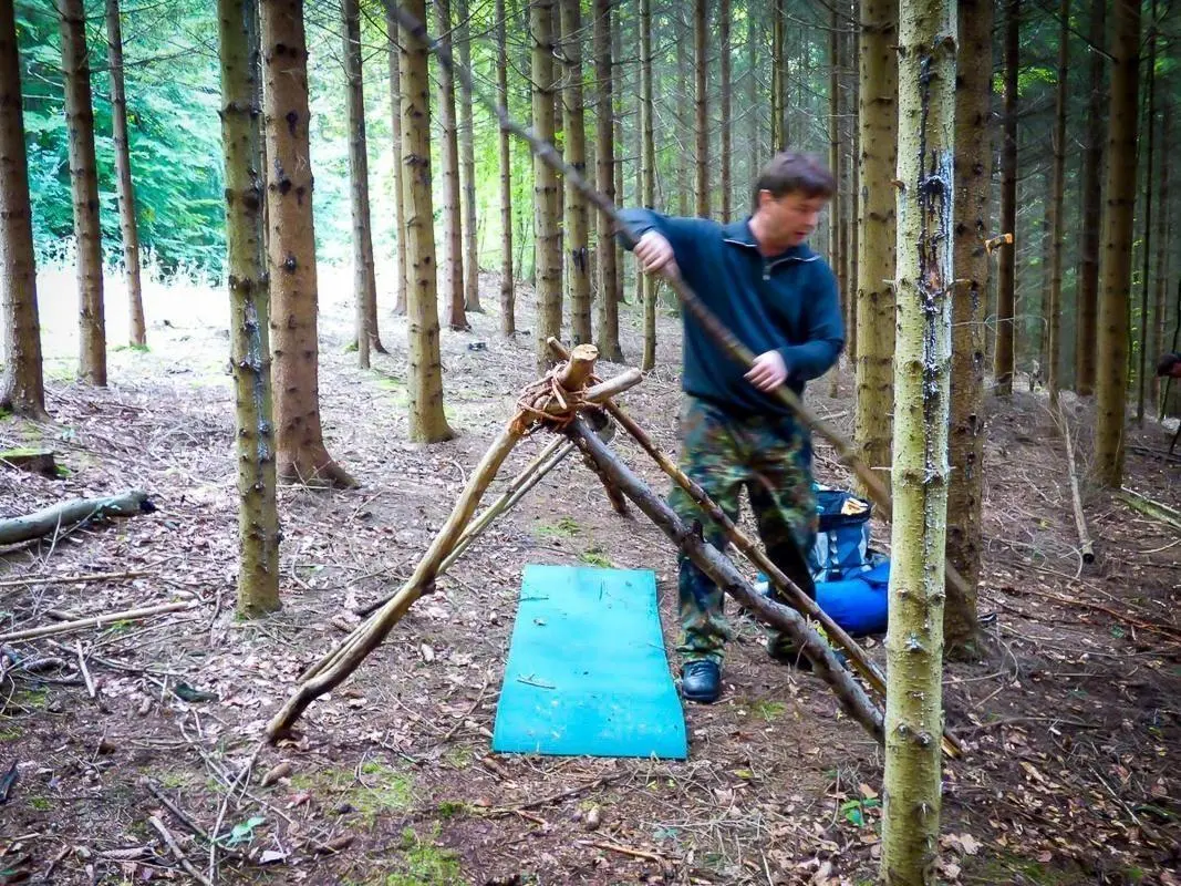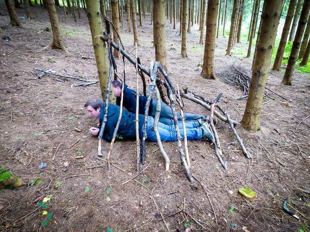 Selbstgebaute Konstruktion aus Ästen dient als Hindernis für Kriechübung