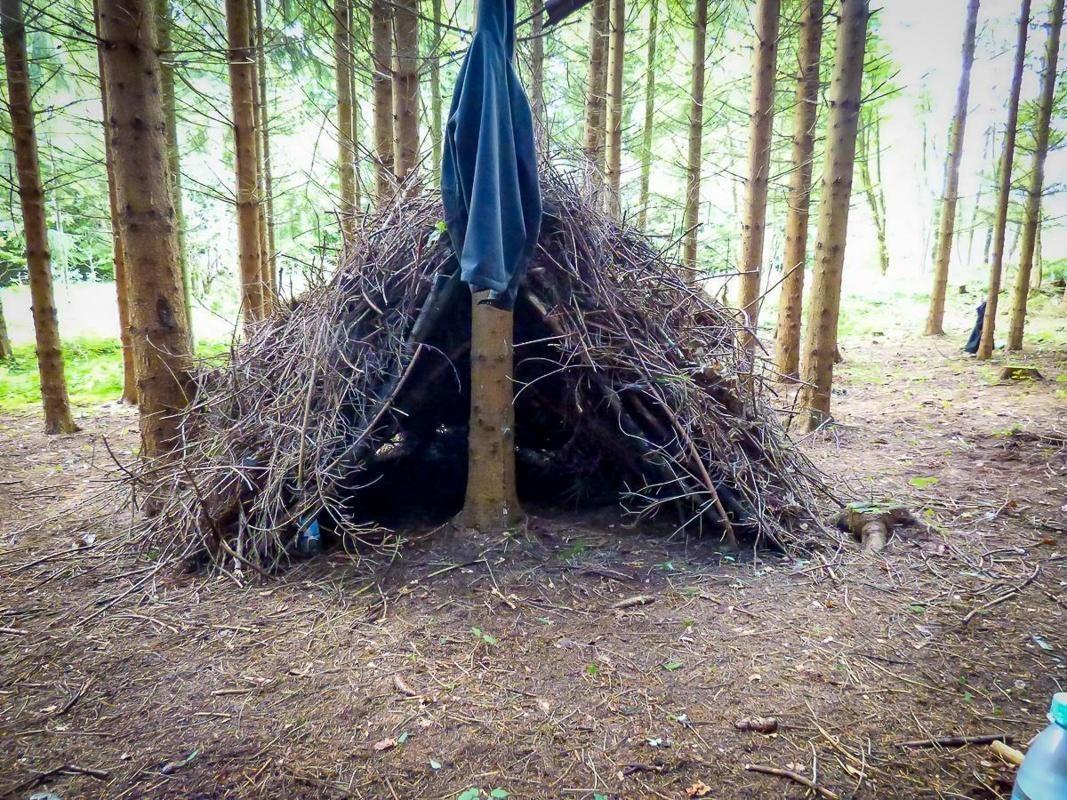Selbstgebaute Laubhütte aus Ästen mit Unterlage im Wald