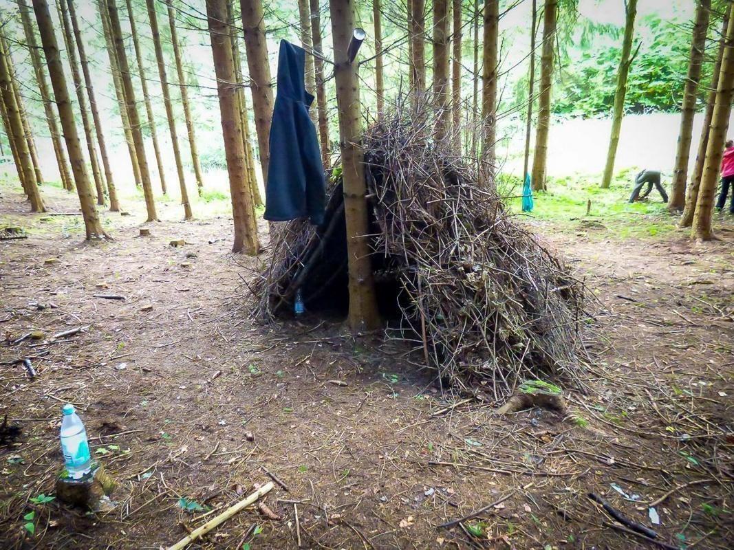 Tarp-Notunterkunft aus Ästen zwischen Bäumen mit Wasserflasche daneben