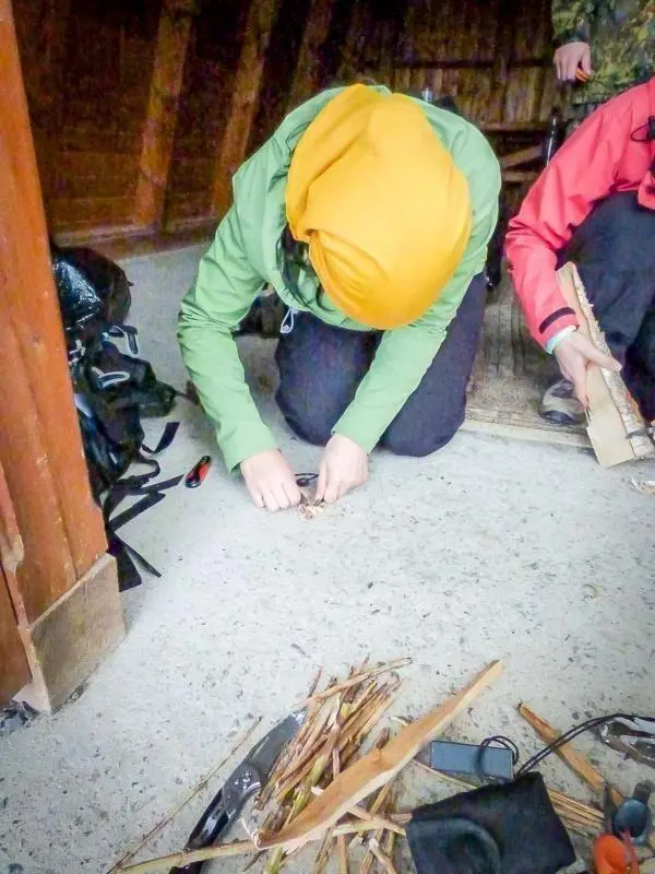 Ein weiterer wichtiger Aspekt des Kurses war der Bau von Unterständen und Wetterschutz. Die Teilnehmer lernten, wie sie aus Ästen und Planen eine schützende Unterkunft errichten konnten. Diese Fähigkeiten sind entscheidend, um sich vor den Elementen zu schützen und einen sicheren Rückzugsort zu schaffen. Während des Trainings wurden auch Techniken des sicheren Arbeitens mit dem Messer vermittelt. Die Teilnehmer schnitzten Holzstücke und spalteten Holz, um sich auf verschiedene Überlebenssituationen vorzubereiten.