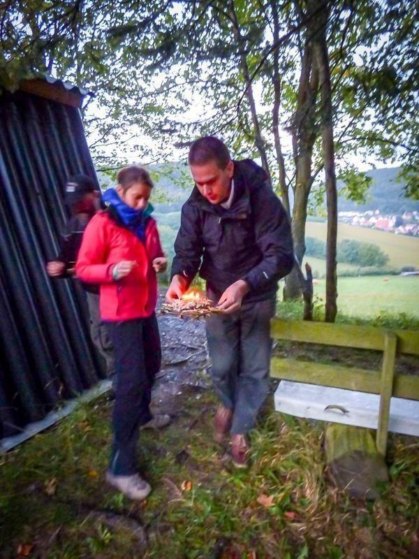 Kleine Flamme entzündet Zunder in der Hand eines Teilnehmers