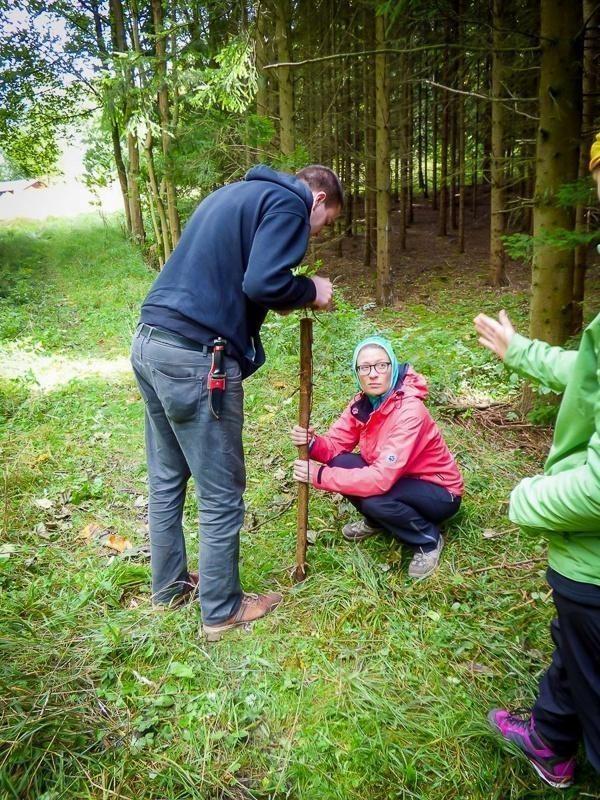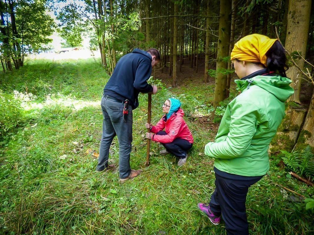 Drei Personen arbeiten im Wald an einer Holzarbeit mit einem Stock