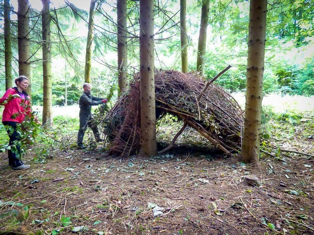 Zwei Personen stehen vor einer selbstgebauten Laubhütte im Wald