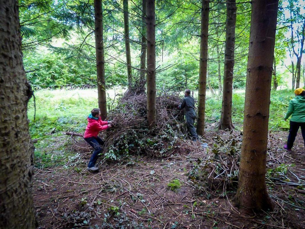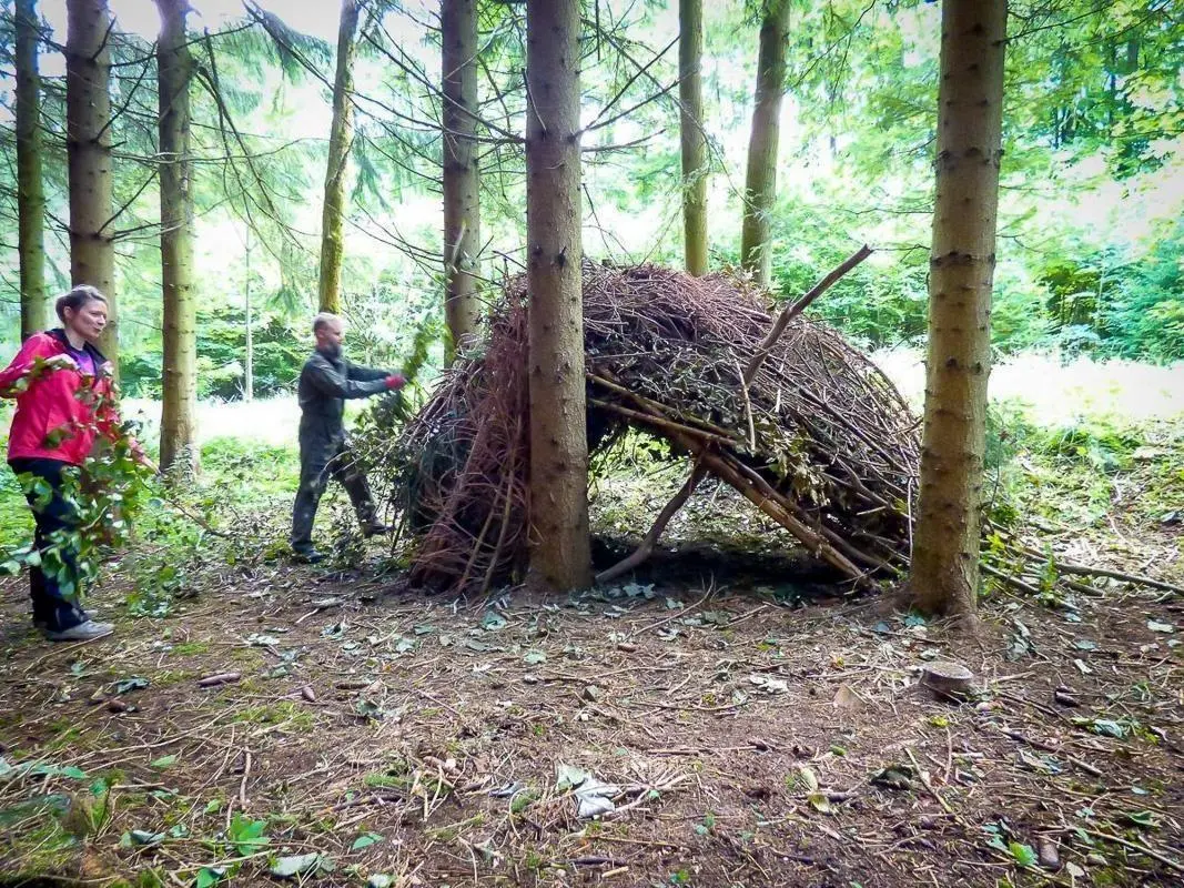 Zwei Personen stapeln Äste und Zweige zu einem Unterschlupf zwischen Bäumen