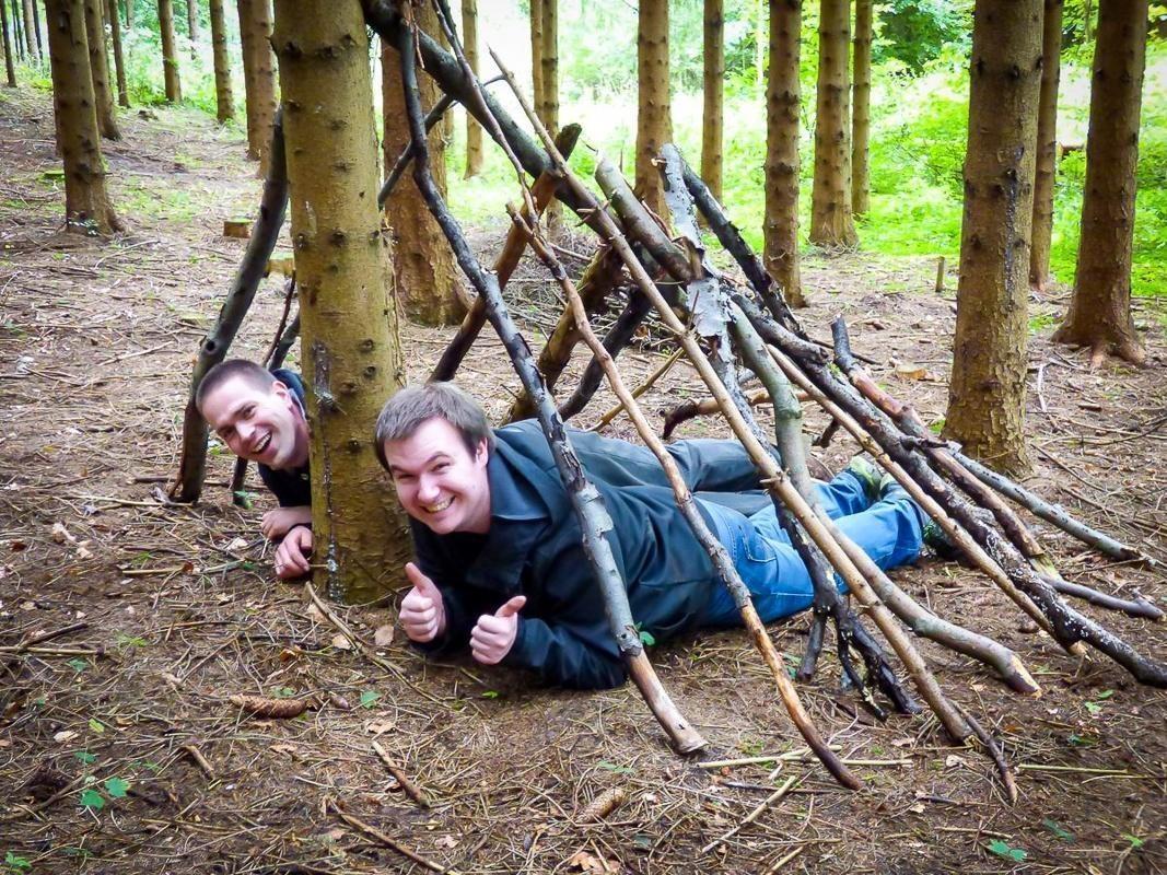 Zwei Personen stehen neben einer selbstgebauten Konstruktion aus Ästen im Wald
