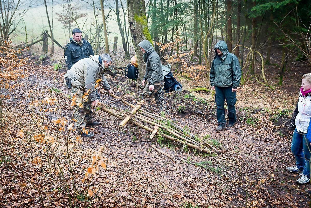 Gruppe baut eine selbstgebaute Konstruktion aus Ästen im Wald