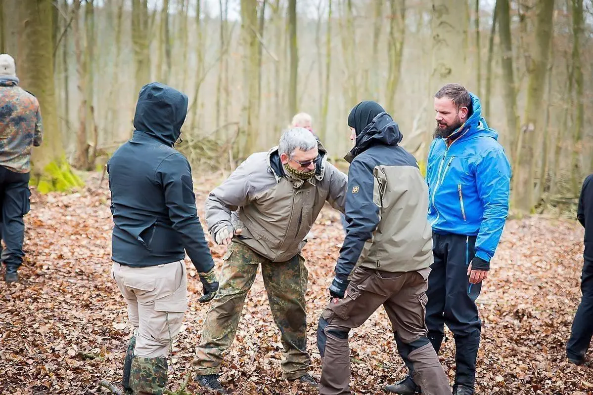 Kampftraining im Wald mit mehreren Teilnehmern in unterschiedlichen Positionen