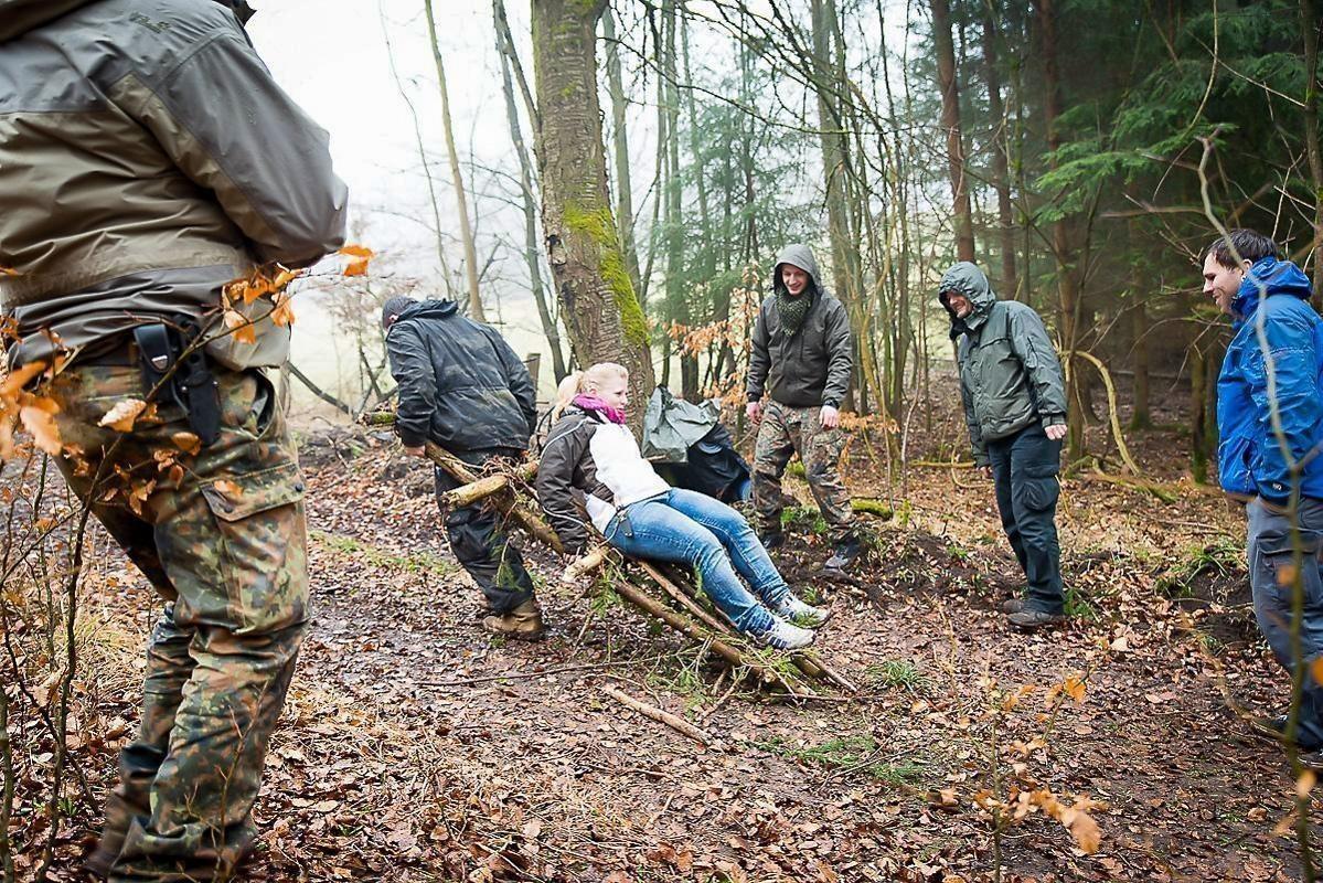 Gruppierung zieht improvisierte Trage mit einer Person durch den Wald