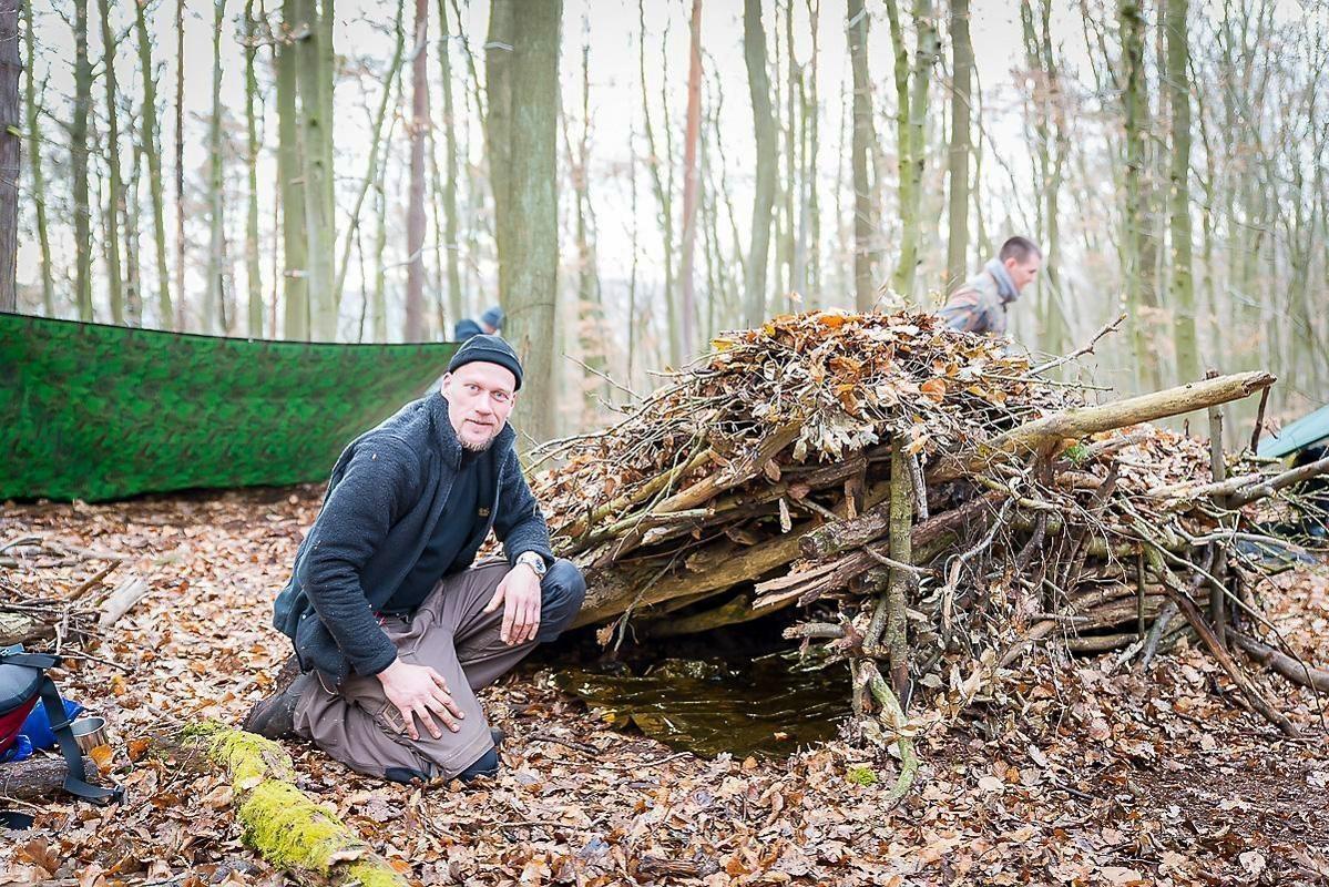 Mann kniet neben einer selbstgebauten Laubhütte im Wald