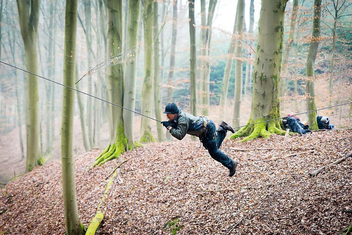 Seilquerung über einen bewaldeten Hang mit Laub und Bäumen
