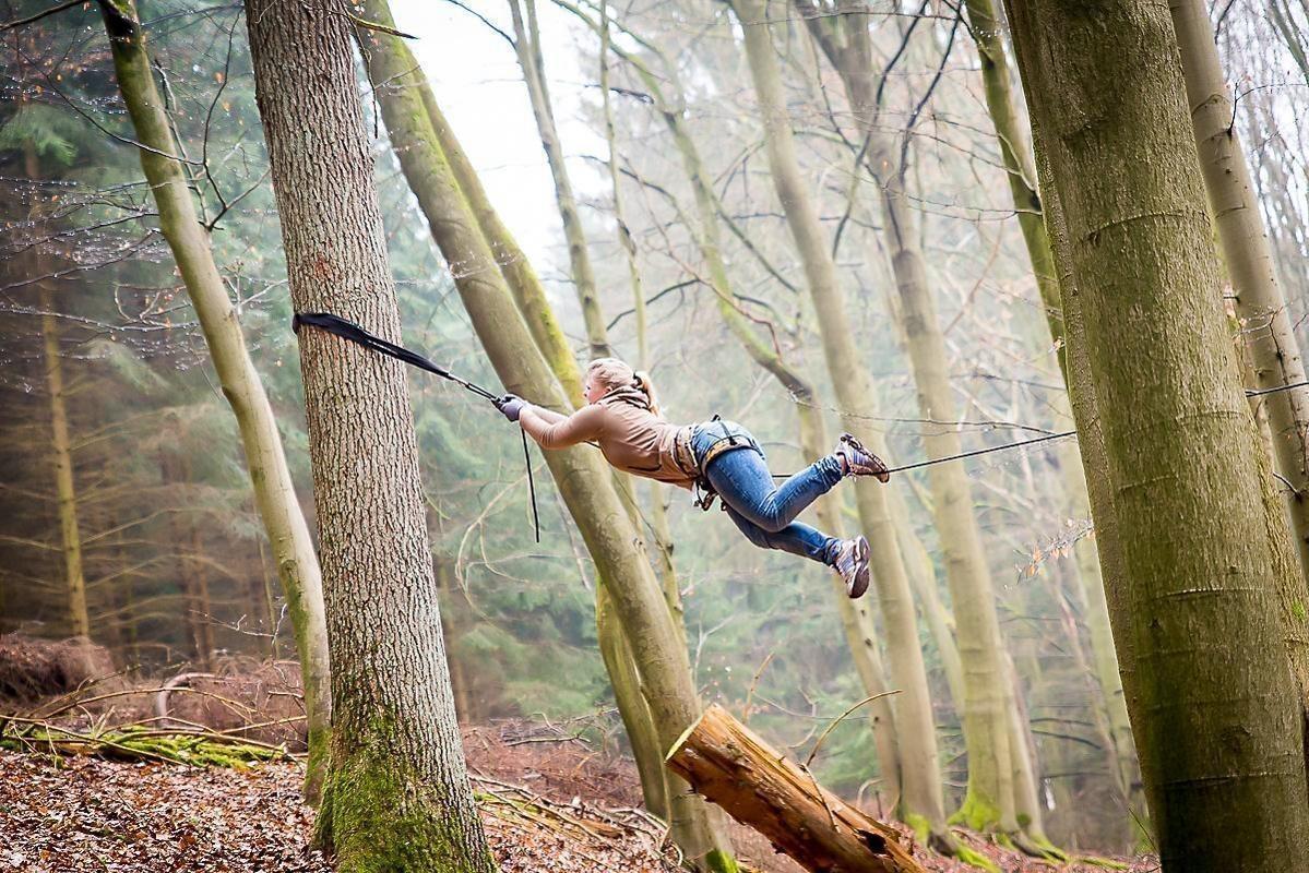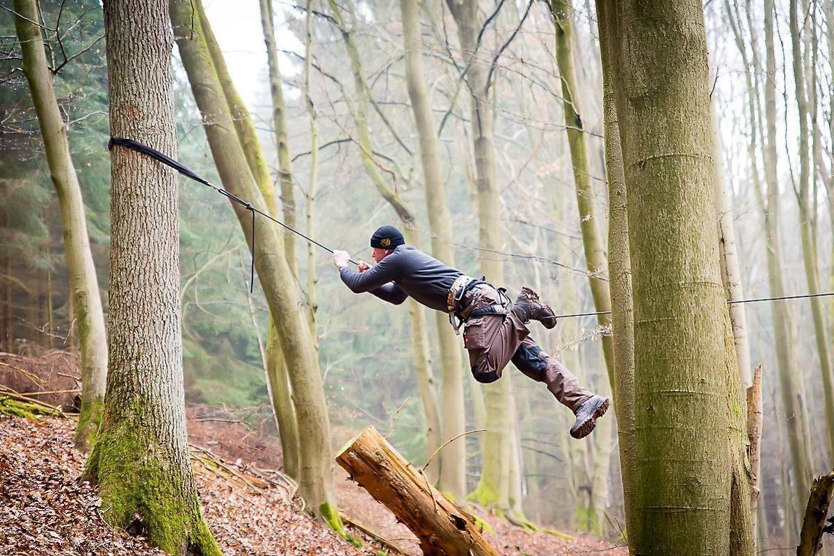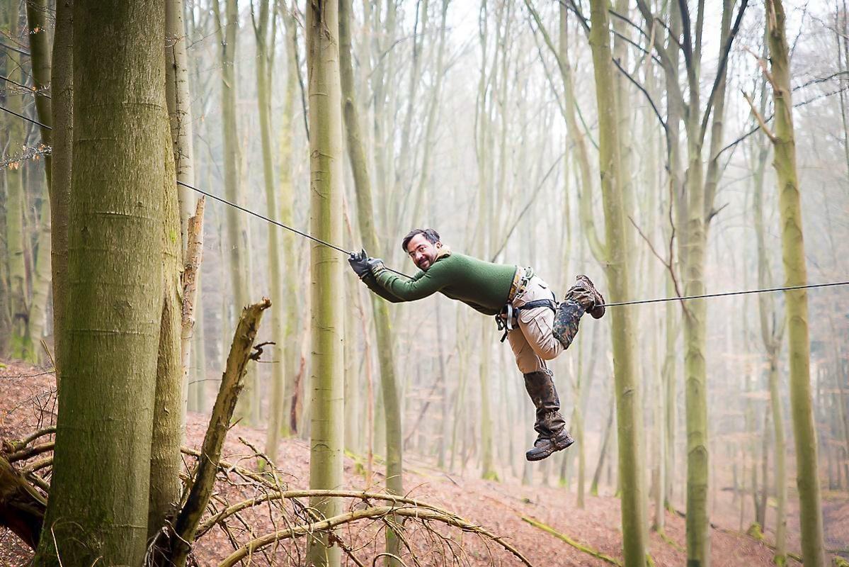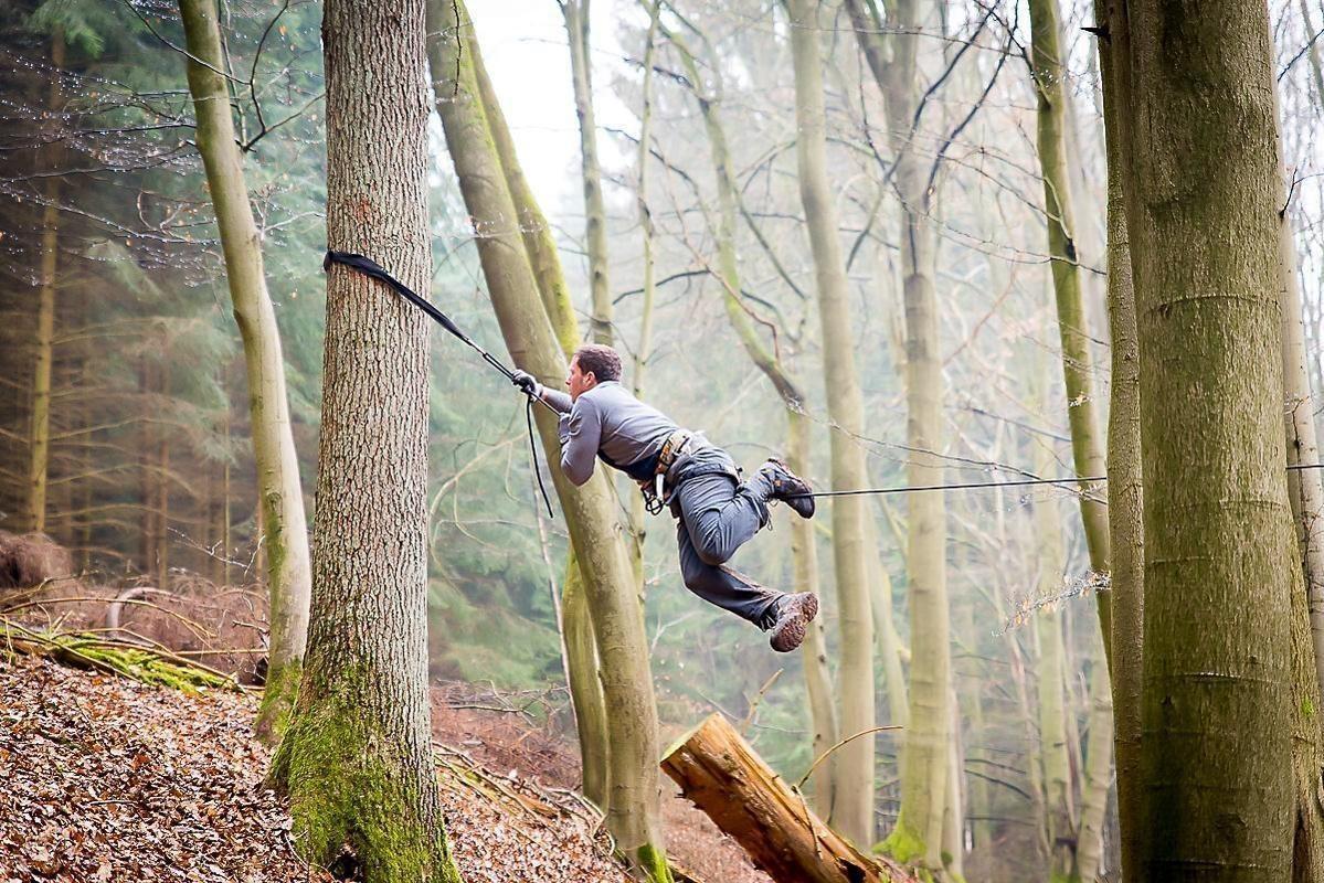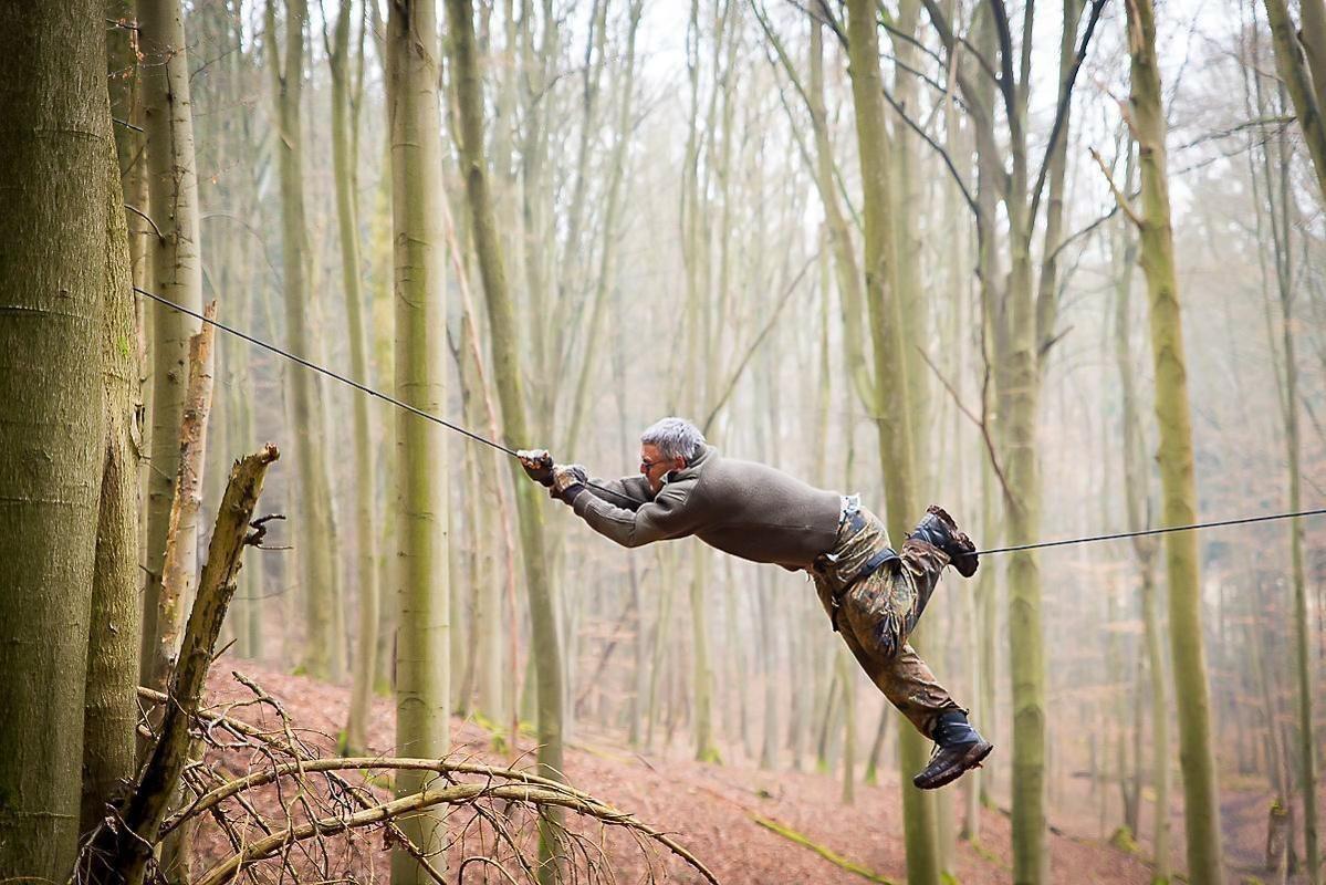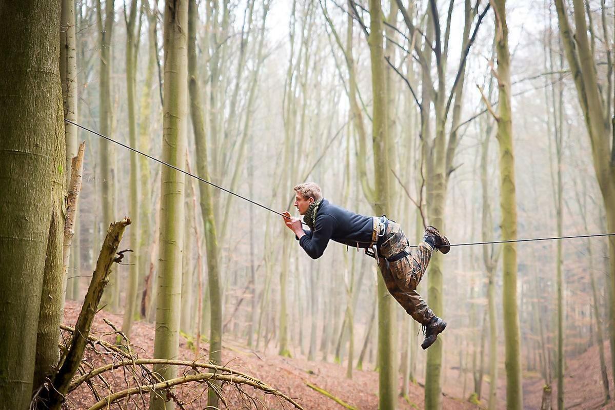 Überquert eine selbstgebaute Seilbrücke zwischen zwei Bäumen
