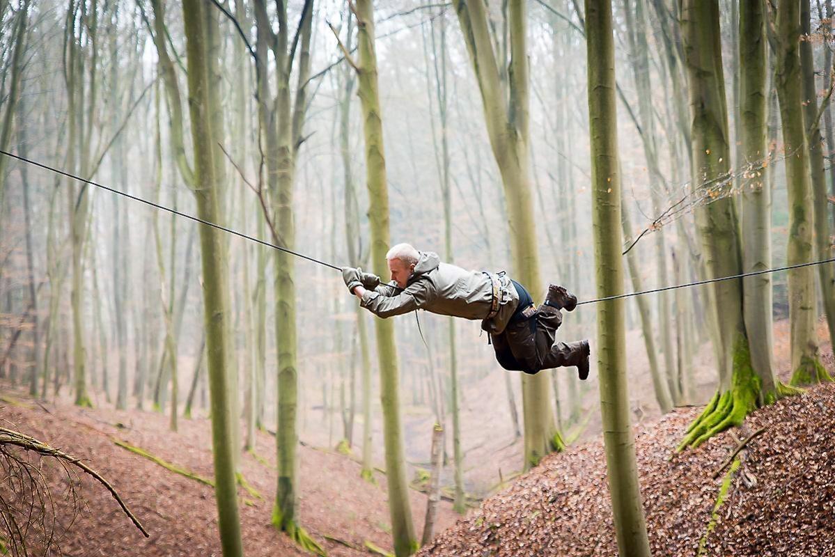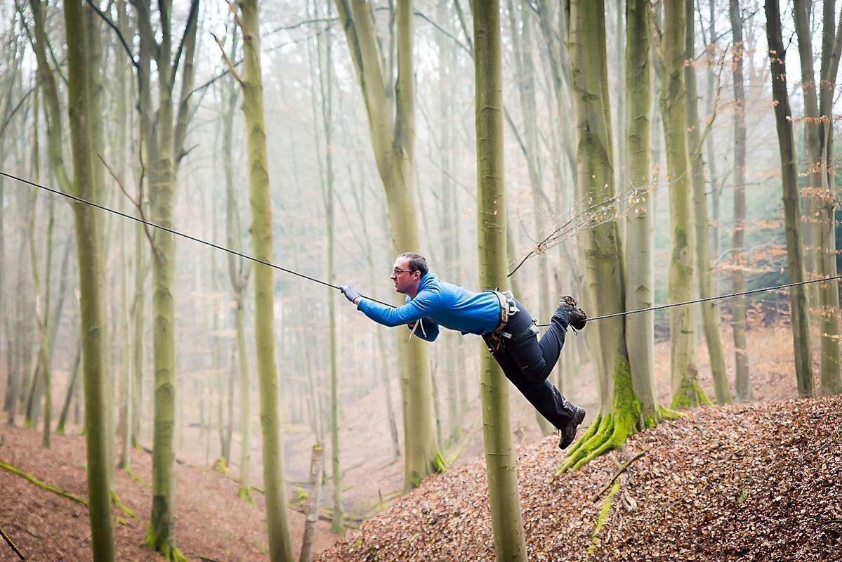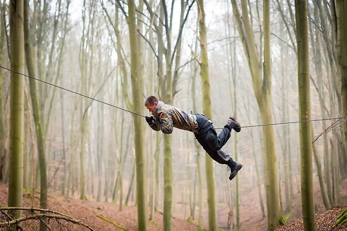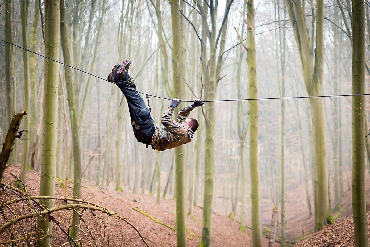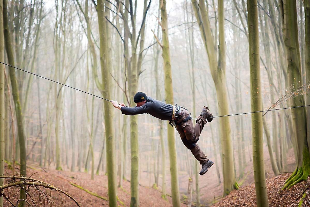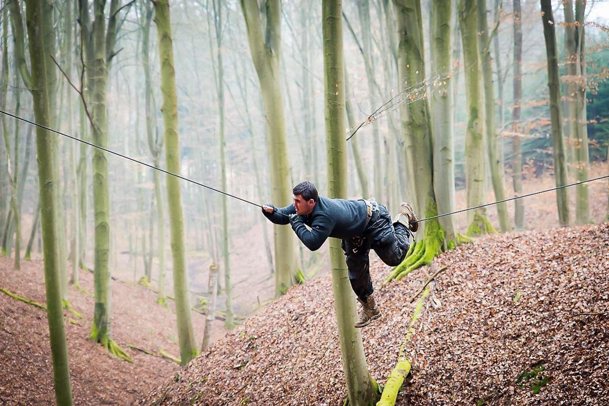 Überquert eine selbstgebaute Seilbrücke zwischen zwei Bäumen