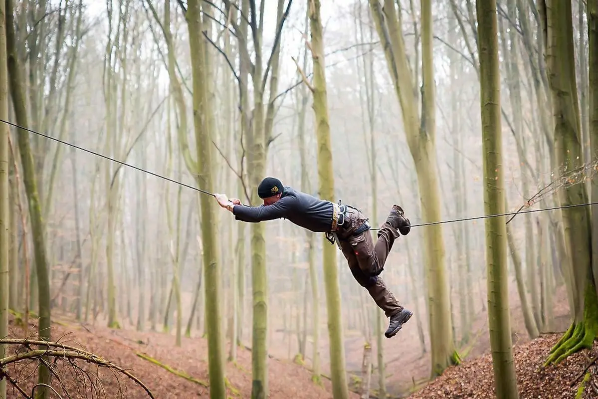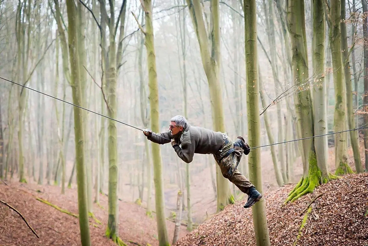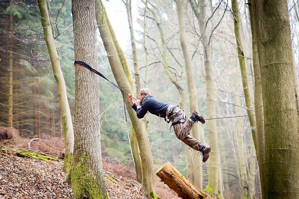Mann überquert eine selbstgebaute Seilbrücke zwischen zwei Bäumen