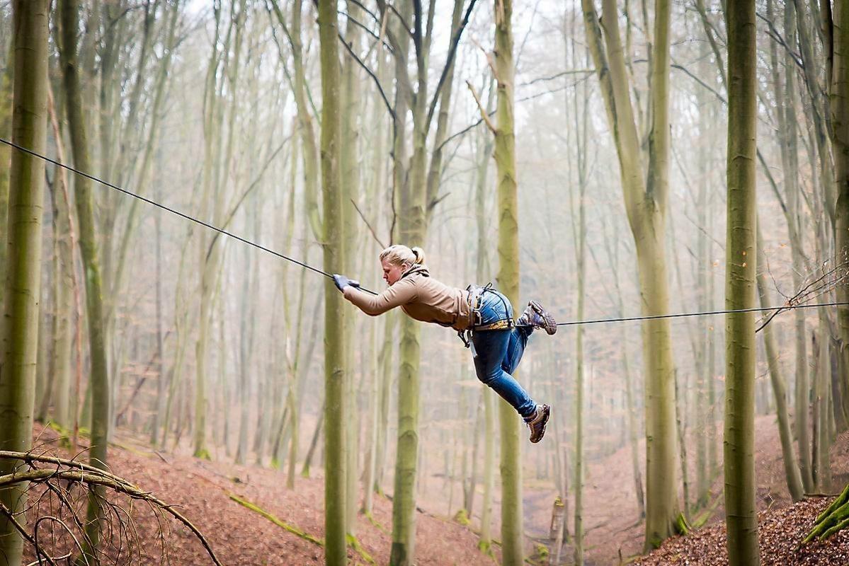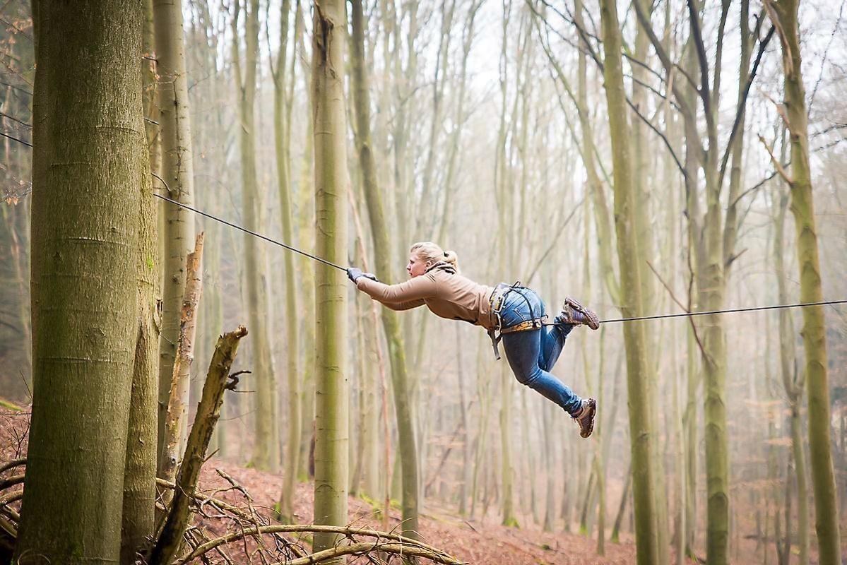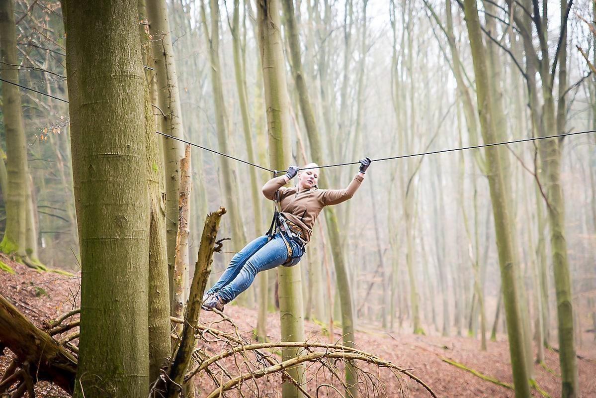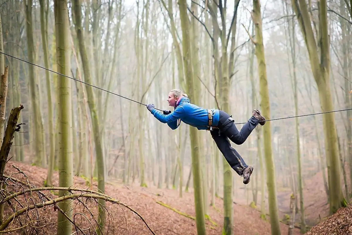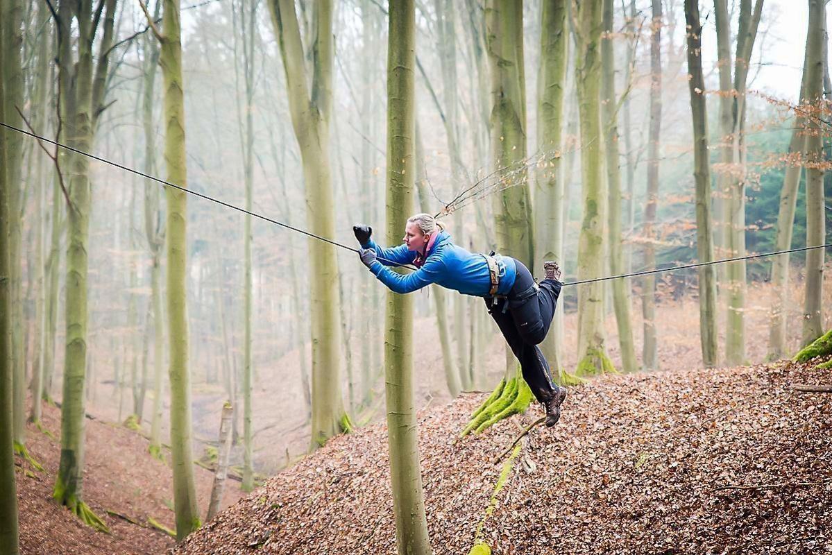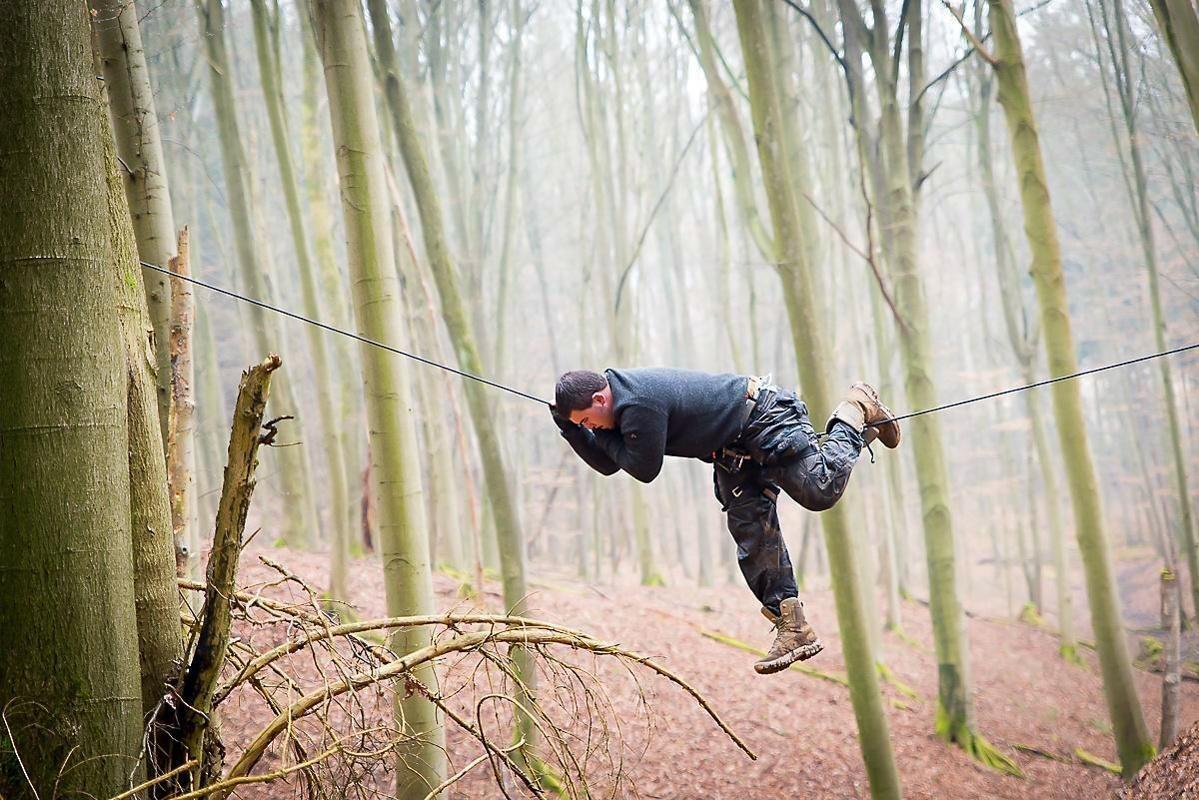 Selbstgebaute Seilquerung wird zwischen Bäumen überquert