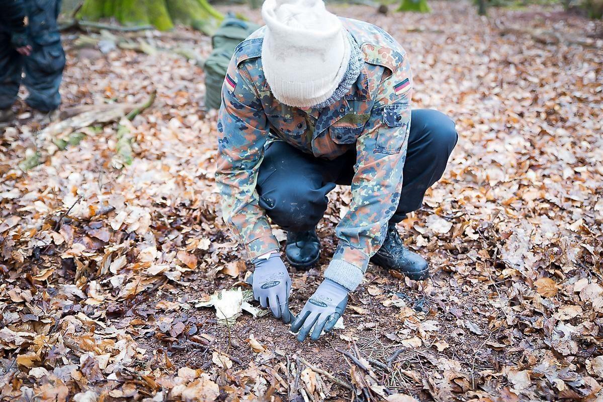 Person kniet im Laub und bereitet den Boden für eine Feuerstelle vor